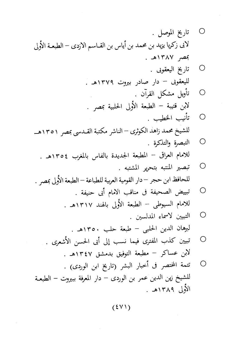 ° تاريخ الموصل. لابى زكريا يزيد بن محمد بن أياس بن القاسم الازدى - الطبعة الأولى بمصر 1387 هـ.