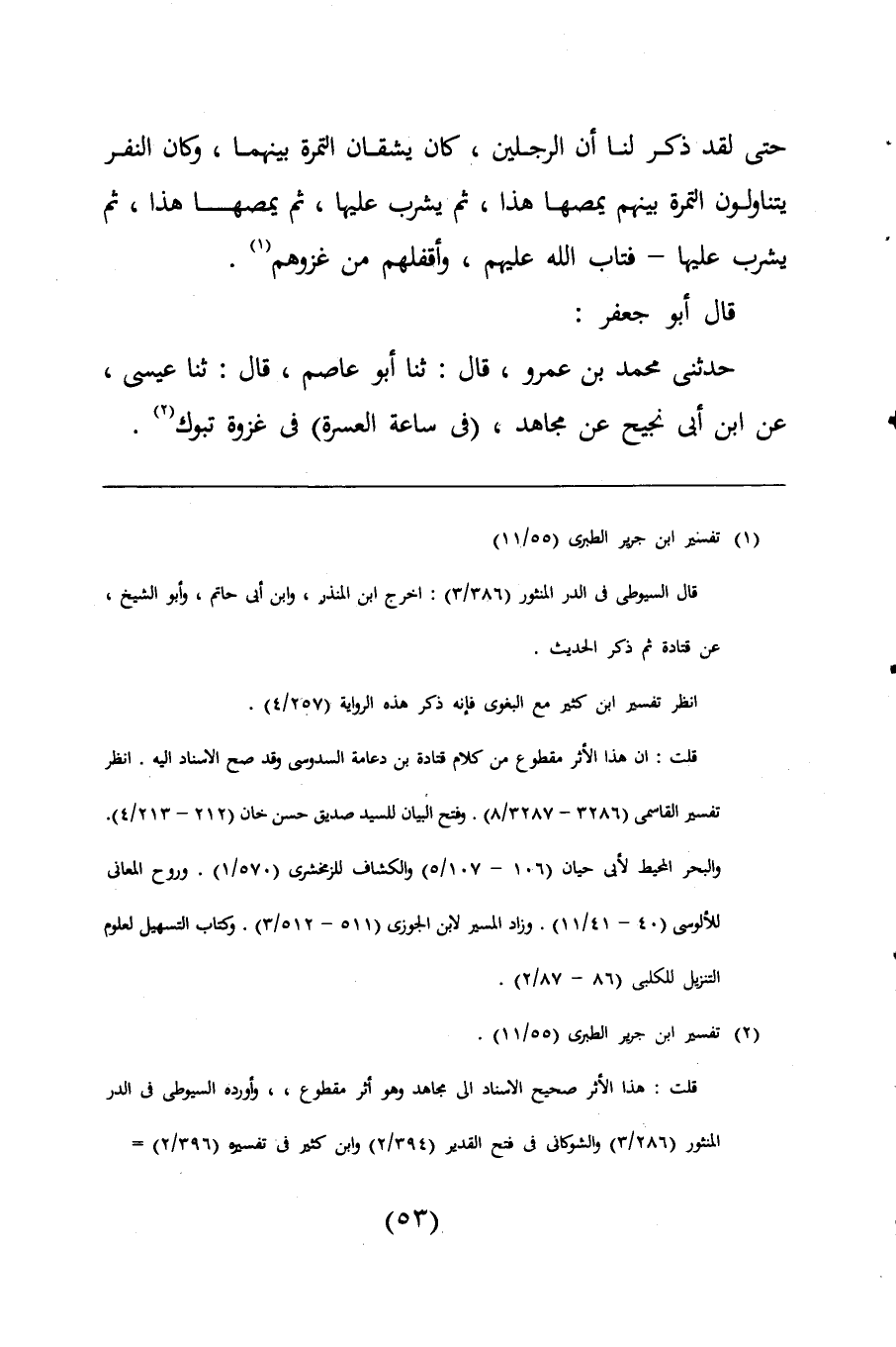 حدثني محمد بن عمرو، قال: ثنا أبو عاصم، قال: ثنا عيسى، عن ابن أبى نجيح عن مجاهد, (فى ساعة العسرة) فى غزوة تبوك (¬2).