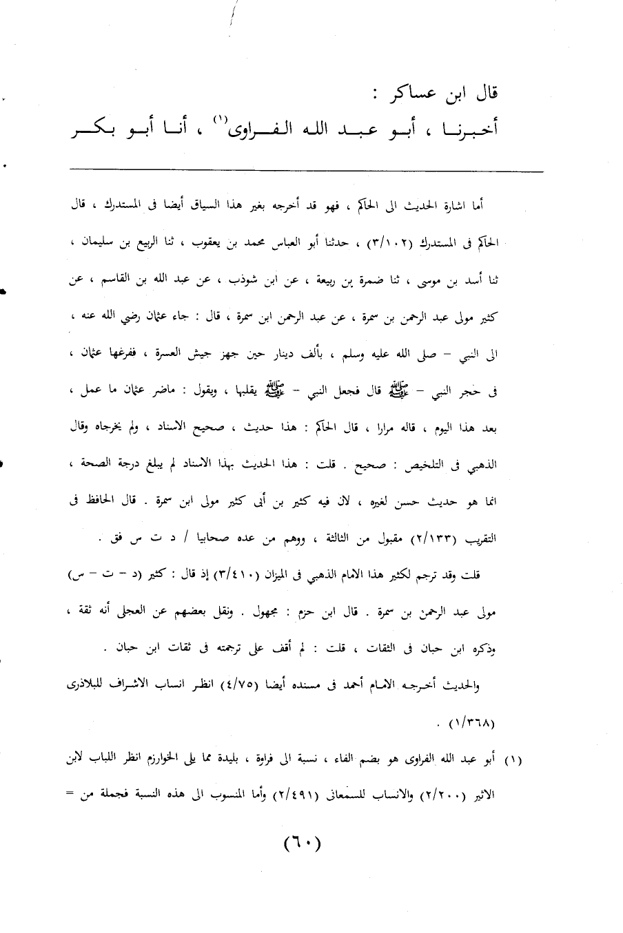 أما اشارة الحديث إلى الحاكم، فهو قد أخرجه بغير هذا السياق أيضًا فى المستدرك، قال الحاكم فى المستدرك (102/ 3)، حدثنا أبو العباس محمد بن يعقوب، ثنا الربيع بن سليمان، ثنا أسد بن موسى، ثنا ضمرة بن ربيعة، عن ابن شوذب، عن عبد اللَّه بن القاسم، عن كثير مولى عبد الرحمن بن سمرة، عن عبد الرحمن ابن سمرة، قال: جاء عثمان رضي اللَّه عنه، إلى النبي -صلى اللَّه عليه وسلم-، بألف دينار حين جهز جيش العسرة، ففرغها عثمان، فى حجر النبي -صلى اللَّه عليه وسلم- قال فجعل النبي -صلى اللَّه عليه وسلم- يقلبها، ويقول: ما ضر عثمان ما عمل، بعد هذا اليوم، قاله مرارا، قال الحاكم: هذا حديث، صحيح الإسناد، لم يخرجاه وقال الذهبي فى التلخيص: صحيح. قلت: هذا الحديث بهذا الإسناد لم يبلغ درجة الصحة، انما هو حديث حسن لغيره، لأن فيه كثير بن أبى كثير مولى ابن سمرة. قال الحافظ فى التقريب (133/ 2) مقبول من الثالثة، ووهم من عده صحابيا/ د ت س فق.