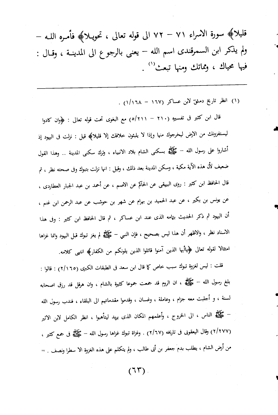 قال ابن كثير فى تفسيره (210 - 211/ 5) مع البغوى تحت قوله تعالى: {وَإِنْ كَادُوا لَيَسْتَفِزُّونَكَ مِنَ الْأَرْضِ لِيُخْرِجُوكَ مِنْهَا وَإِذًا لَا يَلْبَثُونَ خِلَافَكَ إِلَّا قَلِيلًا} قيل: نزلت فى اليهود إذ أشاروا على رسول اللَّه -صلى اللَّه عليه وسلم- بسكنى الشام بلاد الانبياء، وترك سكنى المدينة. . وهذا القول ضعيف لأن هذه الآية مكية، وسكن المدينة بعد ذلك، وقيل: أنها نزلت بتبوك وفى صحته نظر، ثم قال الحافظ ابن كثير: روى البيهقى عن الحاكم عن الاصم، عن أحمد بن عبد الجبار العطاردى، عن يونس بن بكير، عن عبد الحميد بن بهرام عن شهر بن حوشب عن عبد الرحمن ابن غنم، أن اليهود ثم ذكر الحديث بتمامه الذى عند ابن عساكر، ثم قال الحافظ ابن كثير: وفى هذا الإسناد نظر، والاظهر أن هذا ليس بصحيح، فإن النبي -صلى اللَّه عليه وسلم- لم يغز تبوك قبل اليهود وانما غزاها امتثالا لقوله تعالى {يَاأَيُّهَا الَّذِينَ آمَنُوا قَاتِلُوا الَّذِينَ يَلُونَكُمْ مِنَ الْكُفَّارِ} انتهى كلامه.