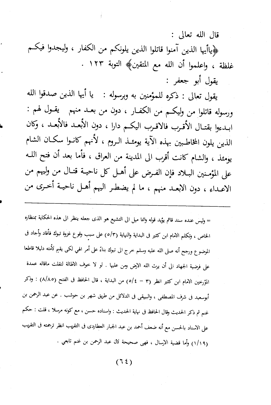 = وليس عنده سند قائم يؤيد قوله وإنما ميل إلى التشيع هو الذى جعله ينظر إلى هذه الحكاية بمنظاره الخاص، وتكلم الإمام ابن كثير فى البداية والنهاية (3/ 5) على سبب وقوع غزوة تبوك فأفاد وأجاد فى الموضوع ورجح أنه صلى اللَّه عليه وسلم خرج إلى تبوك بناءً على أمر الهى لكى يقيم لأمته دليلا قاطعا على فرضية الجهاد إلى أن يرث اللَّه الارض ومن عليها. لولا خوف الاطالة لنقلت ما قاله عمدة المؤرخين الإمام ابن كثير انظر (3 - 5/ 4) من البداية، قال الحافظ فى الفتع (85/ 8): وذكر أبو سعيد فى شرف المصطفى، والبيهقى فى الدلائل من طريق شهر بن حوشب. عن عبد الرحمن بن غنم ثم ذكر الحديث وقال الحافظ فى نهاية الحديث: واسناده حسن، مع كونه مرسلا، قلت: حكم على الاسناد بالحسن مع أنه ضعف أحمد بن عبد الجبار العطاردى فى التقريب انظر ترجمته فى التقريب (1/ 19) وأما قضية الارسال، فهي صحيحة لان عبد الرحمن بن غنم تابعى.