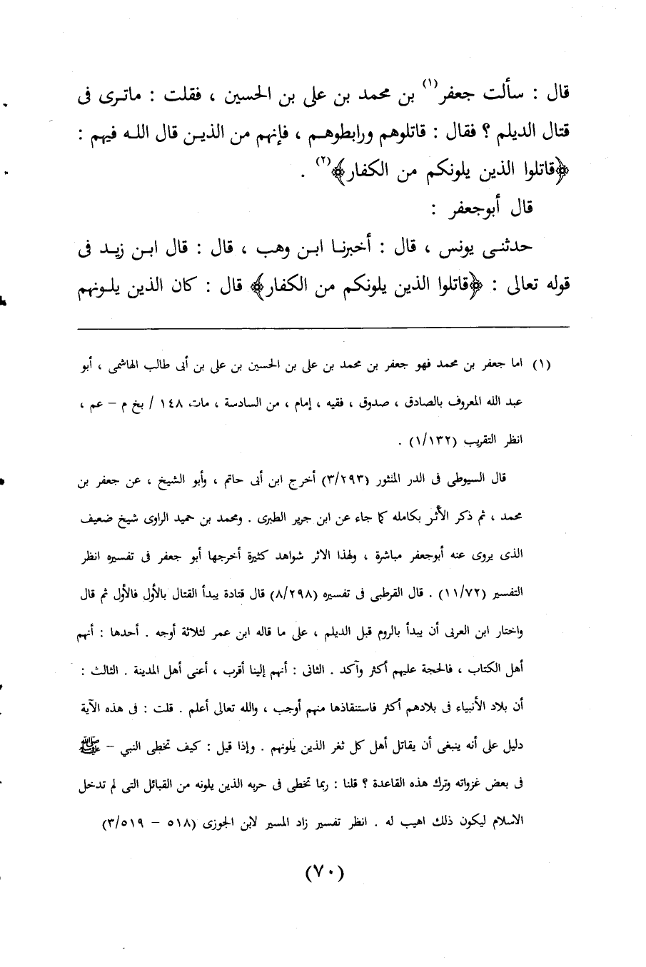 قال: سألت جعفر (¬1) بن محمد بن علي بن الحسين، فقلت: ما ترى فى قتال الديلم؟ فقال: قاتلوهم ورابطوهم، فإنهم من الذين قال اللَّه فيهم: {قَاتِلُوا الَّذِينَ يَلُونَكُمْ مِنَ الْكُفَّارِ} (¬2).