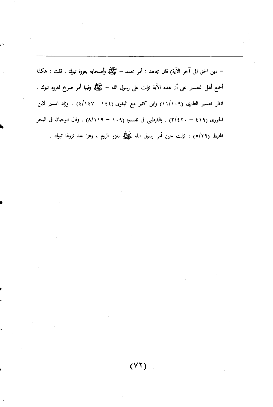 = دِينَ الْحَقِّ} آخر الآية) قال مجاهد: أمر محمد -صلى اللَّه عليه وسلم- وأصحابه بغزوة تبوك. قلت: هكذا أجمع أهل المسير على أن هذه الآية نزلت على رسول اللَّه -صلى اللَّه عليه وسلم- وفيها أمر صريح لغزوة تبوك. انظر تفسير الطبرى (109/ 11) وابن كثير مع البغوى (144 - 147/ 4). وزاد المسير لابن الجوزى (419 - 420/ 3). والقرطبى فى تفسيره (109 - 119/ 8). وقال أبو حيان فى البحر المحيط (29/ 5): نزلت حين أمر رسول اللَّه -صلى اللَّه عليه وسلم- بغزو الروم، وغزا بعد نزولها تبوك.