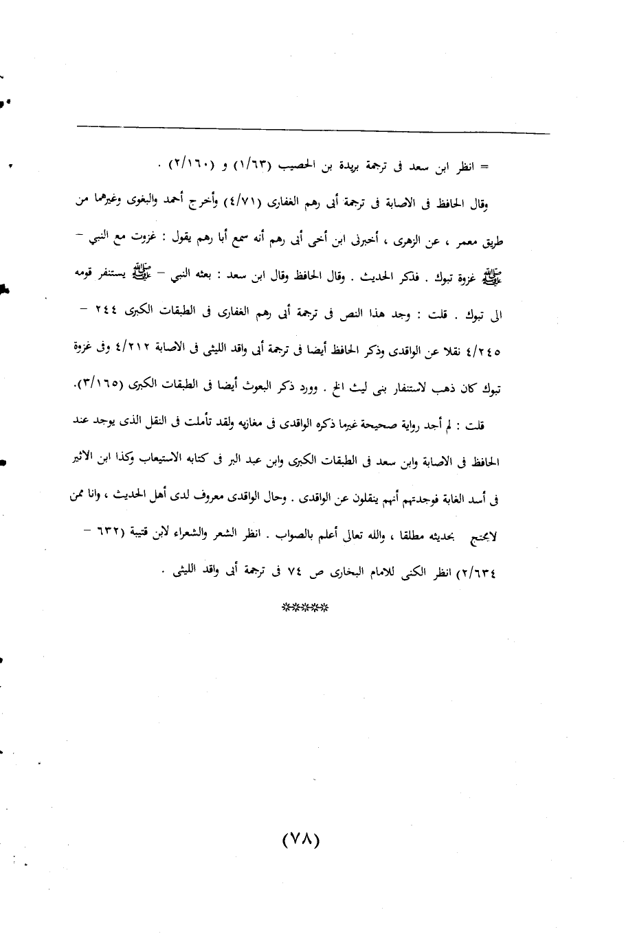 قلت: لم أجد رواية صحيحة غير ما ذكره الواقدى فى مغازيه ولقد تأملت فى النقل الذى يوجد عند الحافظ فى الإصابة وابن سعد فى الطبقات الكبرى وابن عبد البر فى كتابه الاستيعاب بهذا ابن الاثير فى أسد الغابة فوجدتهم أنهما ينقلون عن الواقدى. وحال الواقدى معروف لدى أهل الحديث، وأنا ممن لا يحتج بحديثه مطلقًا، واللَّه تعالى أعلم بالصواب. انظر الشعر والشعراء لابن قتيبة (632 - 634/ 2) انظر الكنى للامام البخارى ص 74 ترجمة أبى واقد الليثي.