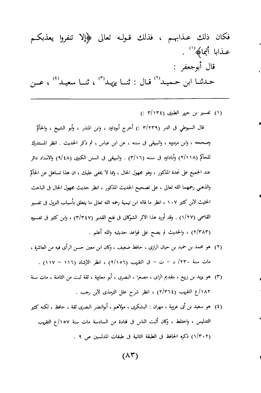 (¬4) هو سعيد بن أبى عروبة، مهران: البشكرى، مولاهم، أبو النضر البصرى ثقة، حافظ، لكنه كثير التدليس، واختلط، وكان أثبت الناس فى قادة من السادسة مات سنة 157/ ع التقريب (302/ 1) ذكره الحافظ فى الطبقة الثانية فى طبقات المدلسين ص 9.