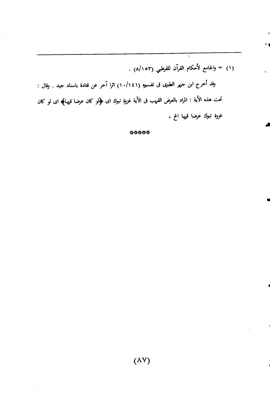 وقد أخرج ابن جرير الطبرى فى تفسيره (141/ 10) أثرًا آخر عن قتادة بإسناد جيد. وقال: تحت هذه الآية: المراد بالعرض القريب فى الآية غزوة تبوك أى {لَوْ كَانَ عَرَضًا قَرِيبًا} أى لو كان غزوة تبوك عرضا قريبًا إلخ.