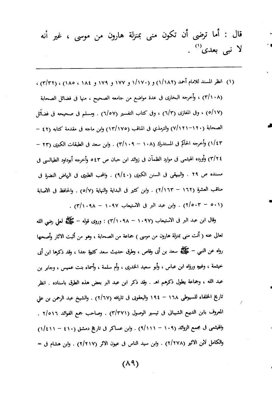 وقال ابن عبد البر فى الاستيعاب (1097 - 1098/ 3): وروى قوله -صلى اللَّه عليه وسلم- لعلي رضي اللَّه تعالى عنه (أنت منى بمنزلة هارون من موسى) جماعة من الصحابة، وهو من أثبت الاثار وأصحها رواه عن النبي -صلى اللَّه عليه وسلم- سعد بن أبى وقاص، وطرق حديث سعد كثيرة جدا، وقد ذكرها ابن أبى خيثمة، وغيره ورواه ابن عباس، وأبو سعيد الخدرى، وأم سلمة، وأسماء بنت عميس، وجابر بن عبد اللَّه، وجماعة يطول ذكرهم اهـ. وقد ذكر ابن عبد البر بعض هذه الطرق باسناده. انظر تاريخ الخلفاء للسيوطى 168 - 194 واليعقوبى فى تاريخه (67/ 2). والشيخ عبد الرحمن بن علي المعروف بابن الديبع الشيبانى فى تيسير الوصول (371/ 3). وصاحب جمع الفوائد 516/ 2. والهيثمى فى مجمع الزوائد (109 - 111/ 9). وابن عساكر فى تاريخ دمشق (410 - 411/ 1) والكامل لابن الاثير (278/ 2). وابن سيد الناس فى عيون الأثر (217/ 2). وابن هشام فى =
