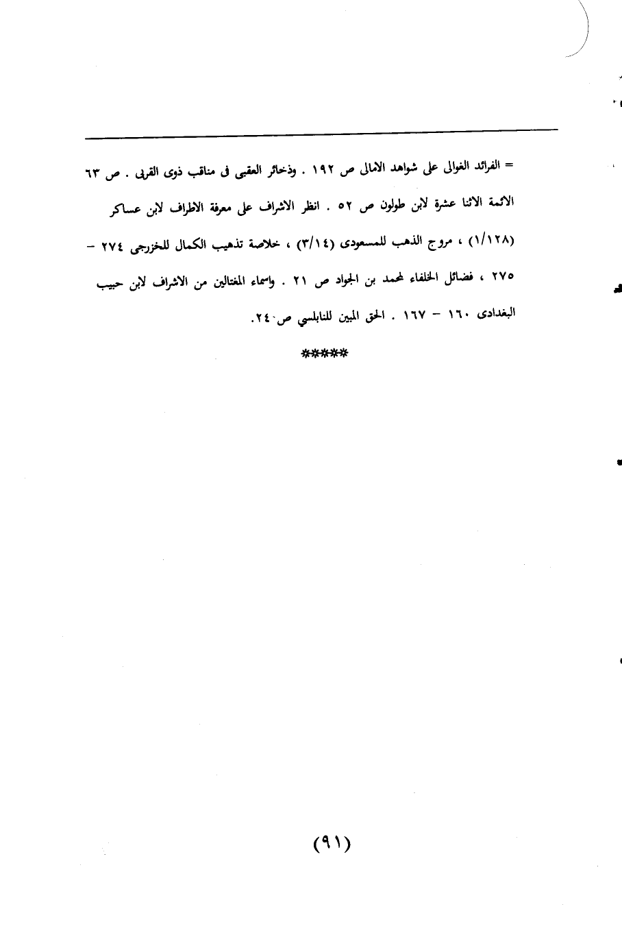 = الفرائد الغوالى على شواهد الامالى ص 192. وذخائر العقبى فى مناقب ذوى القربى. ص 63 الائمة الاثنا عثرة لابن طولون ص 25. انظر الاشراف على معرفة الاطراف لابن عساكر (128/ 1)، مروج الذهب للمسعودى (14/ 3)، خلاصة تذهيب الكمال للخزرجى 274 - 275، فضائل الحلفاء لمحمد بن الجواد ص 21. وأسماء المغتالين من الاشراف لابن حبيب البغدادى 160 - 167. الحق المبين للنابلسى ص 24.