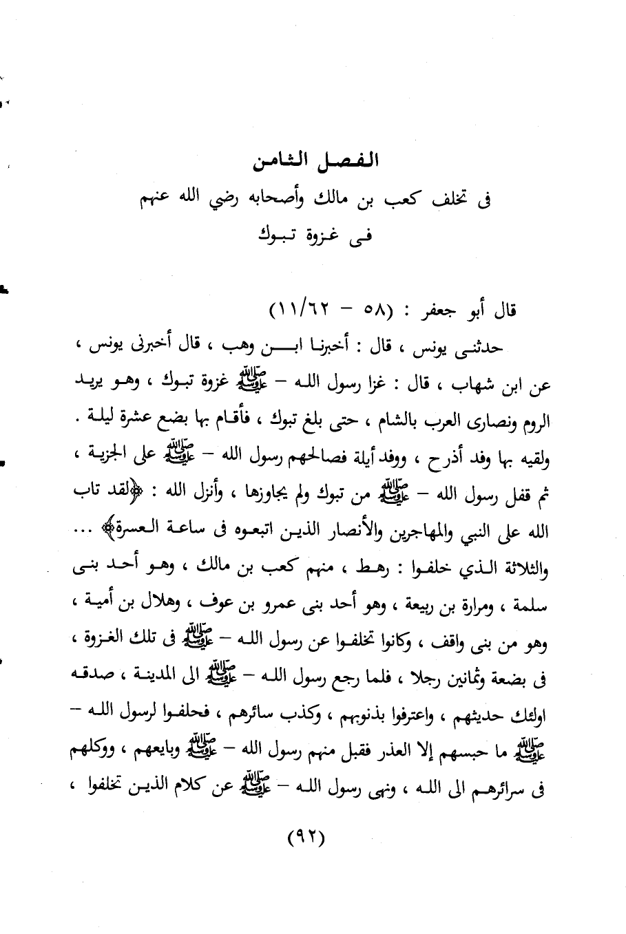 حدثنى يونس، قال: أخبرنا ابن وهب، قال أخبرنى يونس، عن ابن شهاب، قال: غزا رسول اللَّه -صلى اللَّه عليه وسلم- غزوة تبوك، وهو يريد الروم ونصارى العرب بالشام، حتى بلغ تبوك، فأقام بها بضع عشرة ليلة. ولقيه بها وفد أذرح، ووفد أيلة فصالحهم رسول اللَّه -صلى اللَّه عليه وسلم- على الجزية، ثم قفل رسول اللَّه -صلى اللَّه عليه وسلم- من تبوك ولم يجاوزها، وأنزل اللَّه: {لَقَدْ تَابَ اللَّهُ عَلَى النَّبِيِّ وَالْمُهَاجِرِينَ وَالْأَنْصَارِ الَّذِينَ اتَّبَعُوهُ فِي سَاعَةِ الْعُسْرَةِ}. . . والثلاثة الذى خلفوا: رهط، منهم كعب بن مالك، وهو أحد بنى سلمة، ومرارة بن ربيعة، وهو أحد بنى عمرو بن عوف، وهلال بن أمية، وهو من بنى واقف، وكانوا تخلفوا عن رسول اللَّه -صلى اللَّه عليه وسلم- فى تلك الغزوة، فى بضعة وثمانين رجلا، فلمارجع رسول اللَّه -صلى اللَّه عليه وسلم- الى المدينة، صدقه أولئك حديثهم، واعترفوا بذنوبهم، وكذب سائرهم، فحلفوا لرسول اللَّه -صلى اللَّه عليه وسلم- ما حبسهم إلا العذر فقبل منهم رسول اللَّه -صلى اللَّه عليه وسلم- وبايعهم، وكلهم فى سرائرهم الى اللَّه، ونهى رسول اللَّه -صلى اللَّه عليه وسلم- عن كلام الذين تخلفوا،