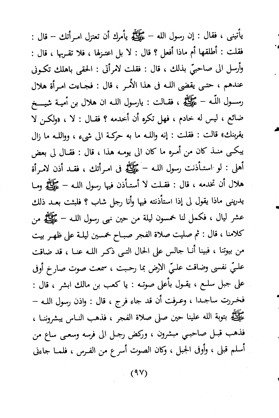 يأتينى، فقال: إن رسول اللَّه -صلى اللَّه عليه وسلم- يأمرك أن تعتزل امرأتك -قال: فقلت: أطلقها أم ماذا أفعل؟ قال: لا بل اعتزلها، فلا تقربها، قال: وأرسل الى صاحبيّ بذلك، قال: فقلت لامرأتى: الحقى بأهلك تكونى عندهم، حتى يقضى اللَّه فى هذا الأمر، قال: فجاءت امرأة هلال رسول اللَّه -صلى اللَّه عليه وسلم-، فقالت: يا رسول اللَّه ان هلال بن أمية شيخ ضائع، ليس له خادم، فهل تكره أن أخدمه؟ فقال: لا، "ولكن لا يقربنك" قالت: فقلت: إنه واللَّه ما به حركة الى شئ، وواللَّه ما زال يبكى منذ كان من أمره ما كان الى يومه هذا، قال: فقال لى بعض أهلى: لو استأذنت رسول اللَّه -صلى اللَّه عليه وسلم- فى امرأتك، فقد أذن لامرأة هلال أن تخدمه، قال: فقلت لا أستأذن فيها رسول اللَّه -صلى اللَّه عليه وسلم- وما يدرينى ماذا يقول لى إذا استأذنته فيها وأنا رجل شاب؟ فلبثت بعد ذلك عشر ليال، فكمل لنا خمسون ليلة من حين نهى رسول اللَّه -صلى اللَّه عليه وسلم- من كلامنا، قال: ثم صليت صلاة الفجر صباح خمسين ليلة على ظهر بيت من بيوتنا، فبينا أنا جالس على الحال الى ذكر اللَّه عنا، قد ضاقت عليّ نفسى وضاقت عليّ الأرض بما رحبت، سمعت صوت صارخ أوفى على جبل سلع، يقول بأعلى صوته: يا كعب بن مالك ابشر، قال: فخررت ساجدا، وعرفت أن قد جاء فرج، قال: واذن رسول اللَّه -صلى اللَّه عليه وسلم- بتوبة اللَّه علينا حين صلى صلاة الفجر، فذهب الناس يبشروننا، فذهب قبل صاحبي مبشرون، وركض رجل الى فرسه وسعى ساع من أسلم قبلى، وأوفى الجبل، وكان الصوت أسرع من الفرس، فلما جاءنى