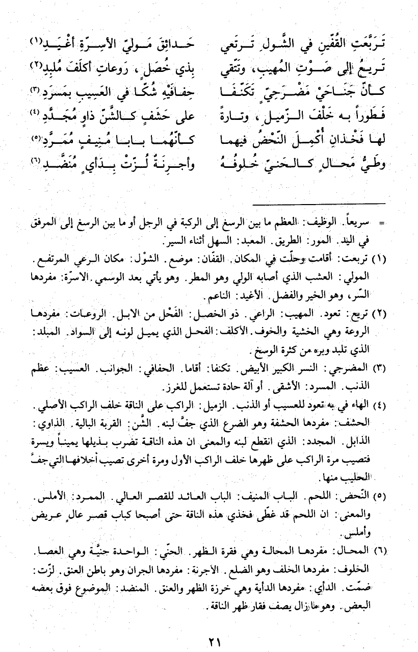 (¬6) الأروع النبّاض: القلب الكثير الخوف. الأخذ: السريع. الململم: الصلب. المرادة: الصخرة الصلبة. الصفيح: الحجر المسطح. المصمّد: المحكم. والمعنى أن قلب الناقة يخاف عند أي حركة وهو كالصخرة بين أضلاع علااض مرصوغ رصفاً محكماً.