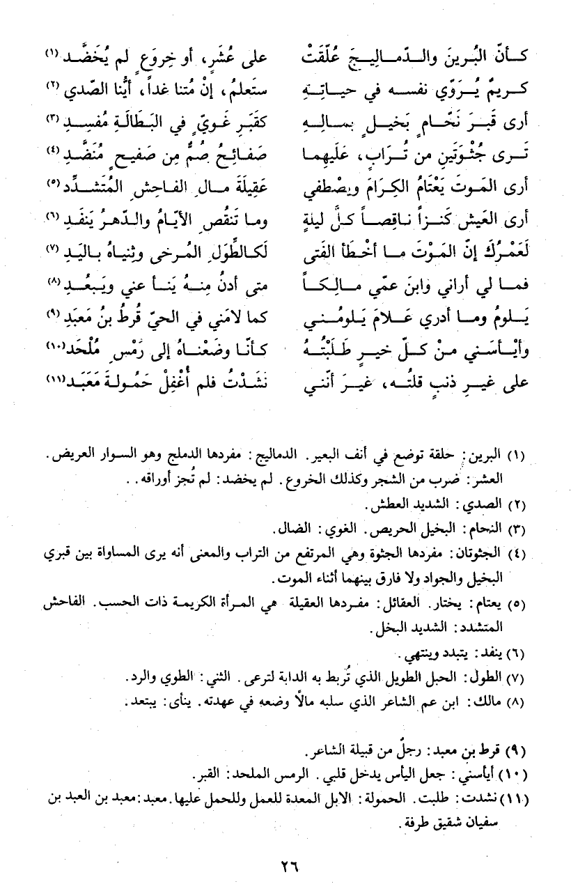 (¬6) الكهاة: الناقة الضخمة. ذات الخيف: صابة الضرع الكبير. الجلالة: الناقة السمينة. العقيلة: الكريمة من النساء وقد مر شرحها. الوبيل: العصا الكبيرة. اليلندد: الشديدة الخصومة. يقول إن هذه الإبل قد مرّت بي شديدة الوف كعقيلة شيخ قد ضعف جسمه من الكبر وهو شيخ شديد الخصومة ويقصد بالشيخ والده حيث بدد طرفة كل ما ورثه عنه من مال وثروة.