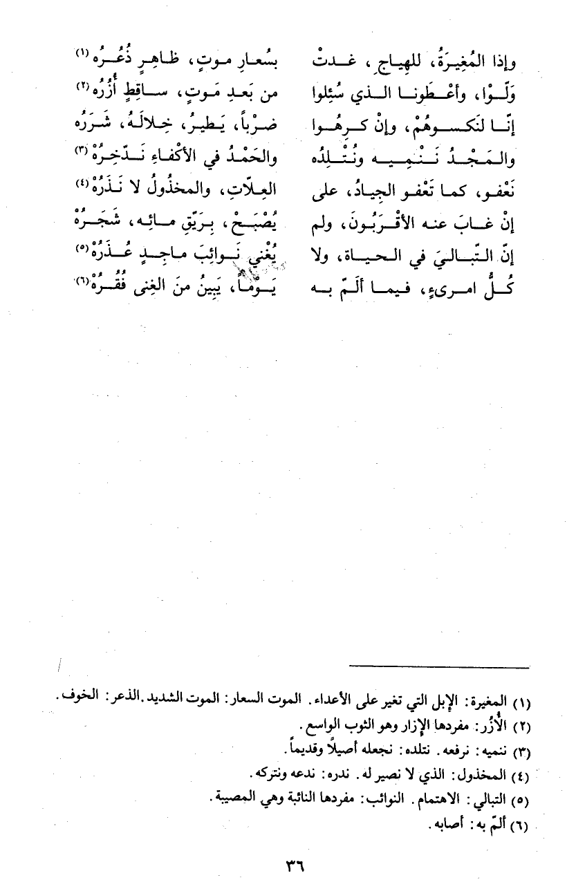 (¬6) الكروان: طائر غرّيد طويل المنقار. نطير: عائدة لطرفة وللمتلمس اللذين احتجزهما عمرو بن هند عند أخيه قابوس. والمعنى أن الطيور باستطاعتها أن تطير أن نحن فلا مفرّ لنا.