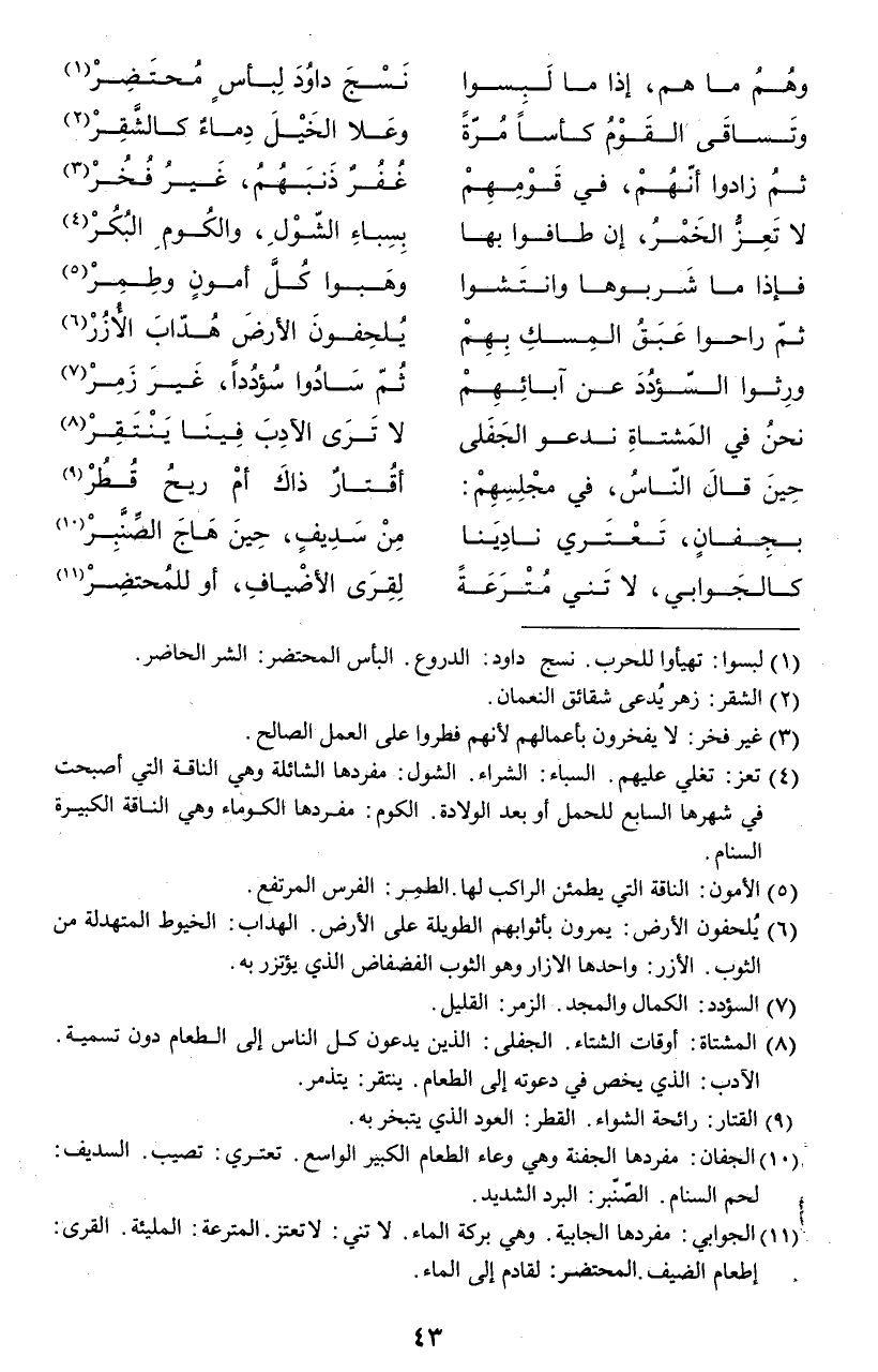 (¬1) اليعابيب: واحدها اليعبوب وهو الفرس الطويل السريع. الوُقح: واحدها الوقاح وهو الصلب الحوافر. الهضبات: مفردها الهضب وهو الكثير سيلان العرق. العُذر: مفردها العذار وهو جانب الخد.