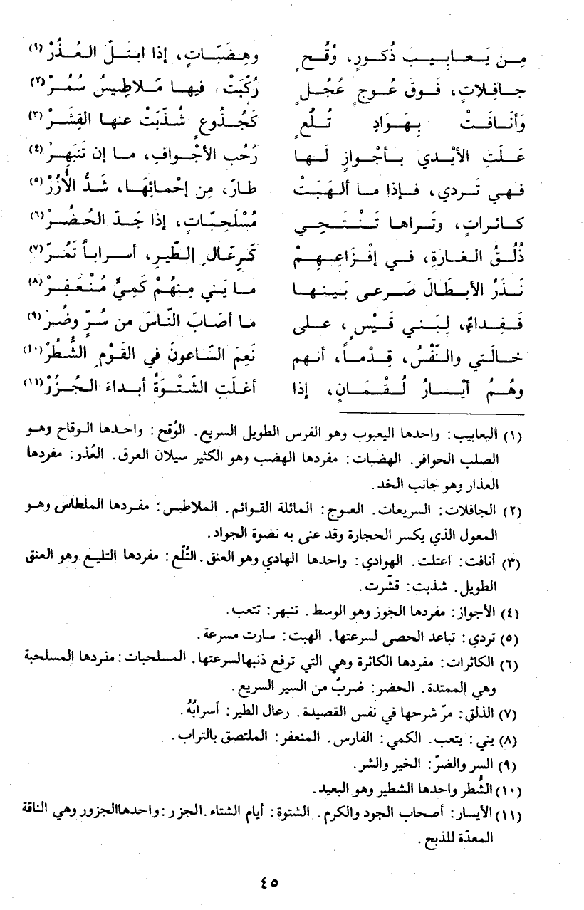 (¬3) الجماد: الأؤض القاحلة التي لا ينبت فيها زرع. البسبس: شجر تُتّخذ من الرحال. المعزاء: الأرض الكثير الحصى. بنات اللبون: صغار الإبل. السلاقمة: مفردها السلقم والسلقمة معناها الكبير من الإبل.