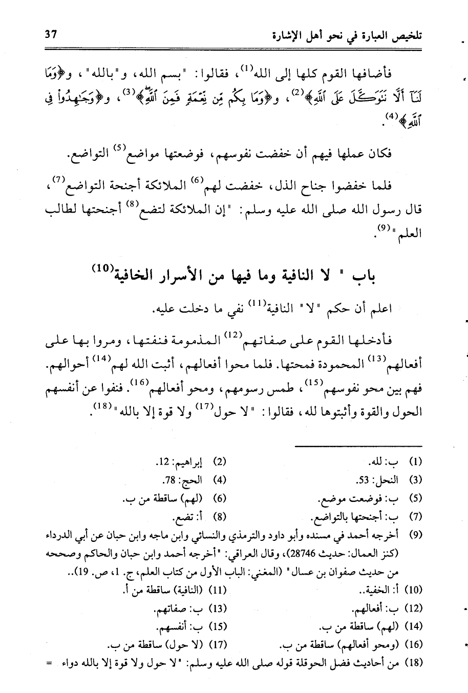فأدخلها القوم على صفاتهم المذمومة فنفتها، ومروا بها على أفعالهم المحمودة فمحتها. فلما محوا أفعالهم، أثبت الله لهم أحوالهم. فهم بين محو نفوسهم، وطمس رسومهم، ومحوا أفعالهم. فنفوا عن أنفسهم الحول والقوة، وأثبتوها لله، فقالوا: لا حول ولا قوة إلا بالله.