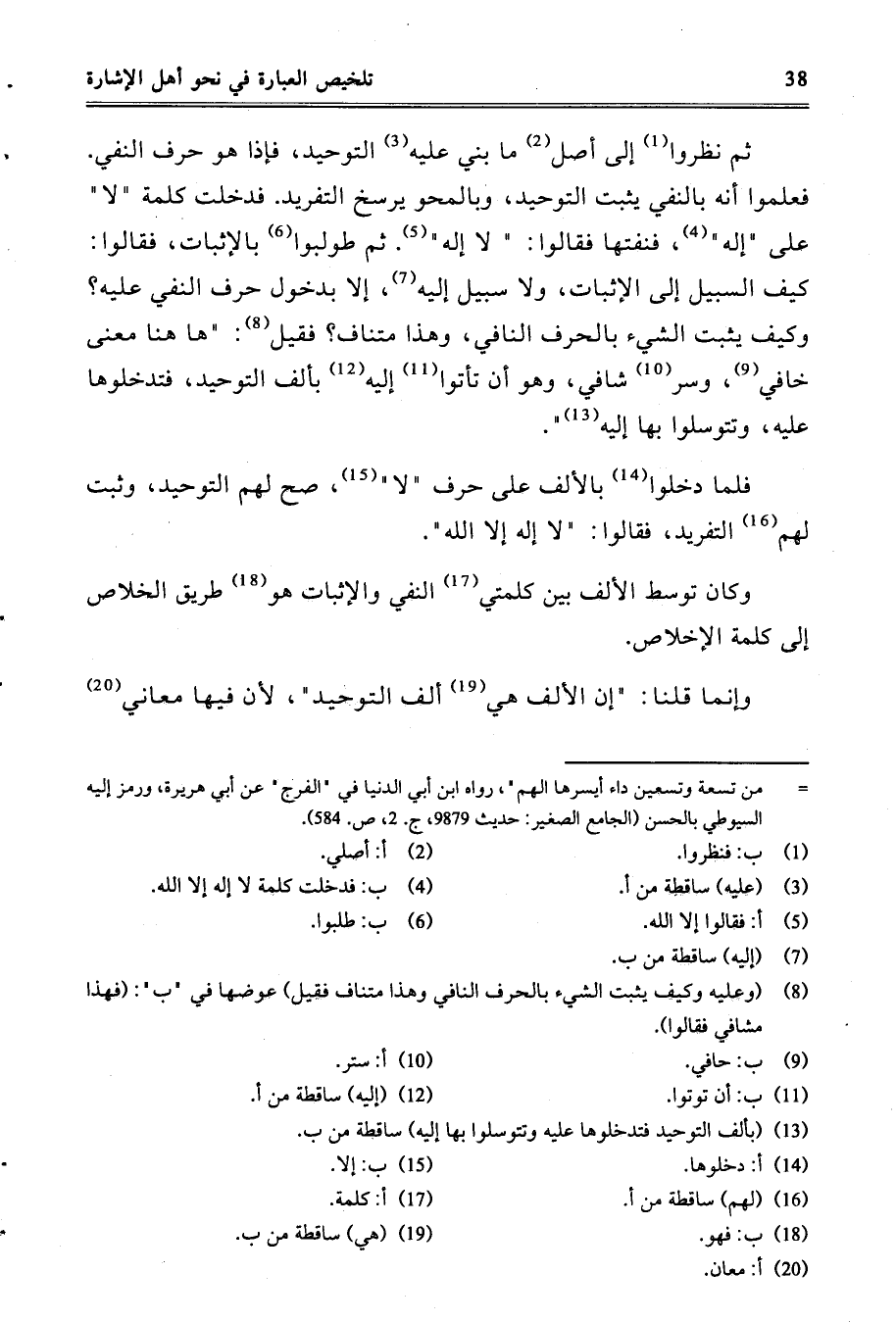 ثم نظروا إلى أصل ما بني عليه التوحيد، فإذا هو حرف النفي. فعلموا أنه بالنفي يثبت التوحيد، وبالمحو يرسخ التفريد. فدخلت كلمة لا على إله، فنفتها فقالوا: لا إله. ثم طولبوا بالإثبات، فقالوا: كيف السبيل إلى الإثبات، ولا سبيل إليه إلا بدخول حرف النفي عليه؟ وكيف يثبت الشيء بالحرف النافي، وهذا متناف؟ فقيل: ها هنا معنى خافٍ، وسر شافٍ، وهو أن تأتوا إليه بألف التوحيد، فتدخلوها عليه، وتتوسلوا بها إليه.