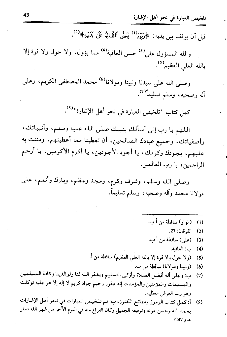 كمل كتاب (تلخيص العبارة نحو أهل الإشارة).