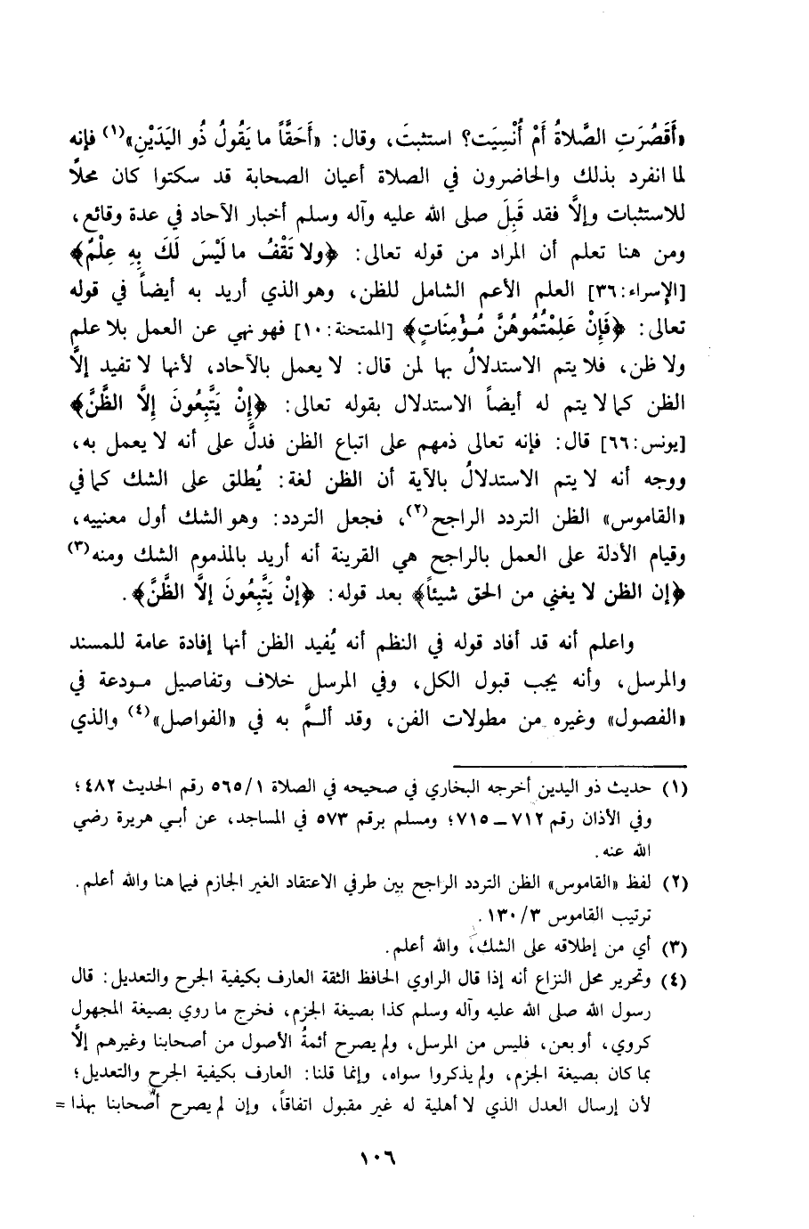 أقصرت الصَّلَاة أم نسيت استثبت وَقَالَ أحقا مَا يَقُول ذُو الْيَدَيْنِ فَإِنَّهُ لما انْفَرد بذلك والحاضرون فِي الصَّلَاة أَعْيَان الصَّحَابَة قد سكتوا كَانَ محلا للاستثبات وَإِلَّا فقد قبل صلى الله عَلَيْهِ وَسلم أَخْبَار الْآحَاد فِي عدَّة وقائع وَمن هُنَا تعلم أَن المُرَاد من قَوْله تَعَالَى {وَلَا تقف مَا لَيْسَ لَك بِهِ علم} الْعلم الْأَعَمّ الشَّامِل للظن وَهُوَ الَّذِي أُرِيد بِهِ أَيْضا فِي قَوْله تَعَالَى {فَإِن علمتموهن مؤمنات} فَهُوَ نهي عَن الْعَمَل بِلَا علم وَلَا ظن فَلَا يتم الِاسْتِدْلَال بهَا لمن قَالَ لَا يعْمل بالآحاد لِأَنَّهَا لَا تفِيد إِلَّا الظَّن كَمَا لَا يتم لَهُ أَيْضا الِاسْتِدْلَال بقوله تَعَالَى {إِن يتبعُون إِلَّا الظَّن} قَالَ فَإِنَّهُ تَعَالَى ذمهم على اتِّبَاع الظَّن فَدلَّ على أَنه لَا يعْمل بِهِ وَوجه أَنه لَا يتم الِاسْتِدْلَال بِالْآيَةِ أَن الظَّن لُغَة يُطلق على الشَّك كَمَا فِي الْقَامُوس الظَّن التَّرَدُّد الرَّاجِح فَجعل التَّرَدُّد وَهُوَ الشَّك أول معنييه وَقيام الْأَدِلَّة على الْعَمَل بالراجح هِيَ الْقَرِينَة أَنه أُرِيد بالمذموم الشَّك وَمِنْه {إِن الظَّن لَا يُغني من الْحق شَيْئا} بعد قَوْله {إِن يتبعُون إِلَّا الظَّن}