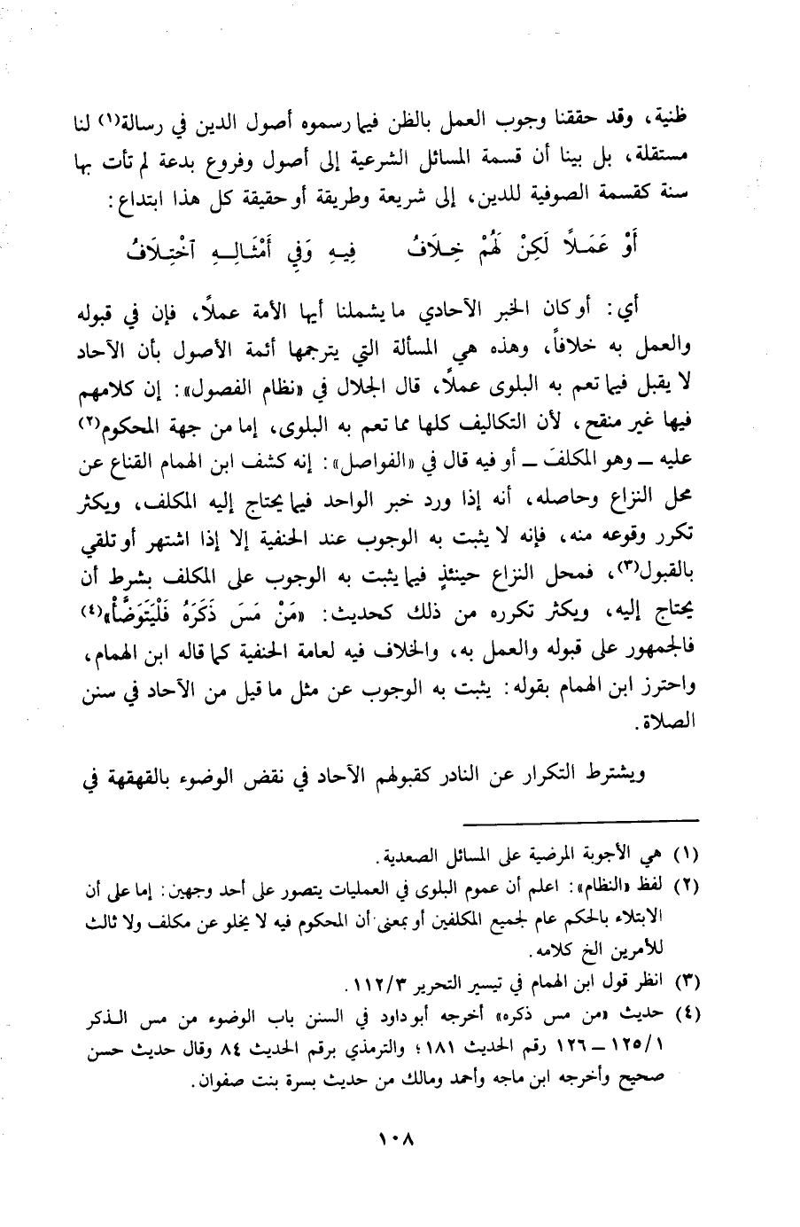 ظنية وَقد حققنا وجوب الْعلم بِالظَّنِّ فِيمَا رسموه أصُول الدّين فِي رِسَالَة لنا مُسْتَقلَّة بل بَينا أَن قسْمَة الْمسَائِل الشَّرْعِيَّة إِلَى أصُول وفروع بِدعَة لم تأت بهَا سنة كقسمة الصُّوفِيَّة للدّين إِلَى شَرِيعَة وَطَرِيقَة أَو حَقِيقَة كل هَذَا ابتداع ... أَو عملا لَكِن لَهُم خلاف ... فِيهِ وَفِي أَمْثَاله اخْتِلَاف ...