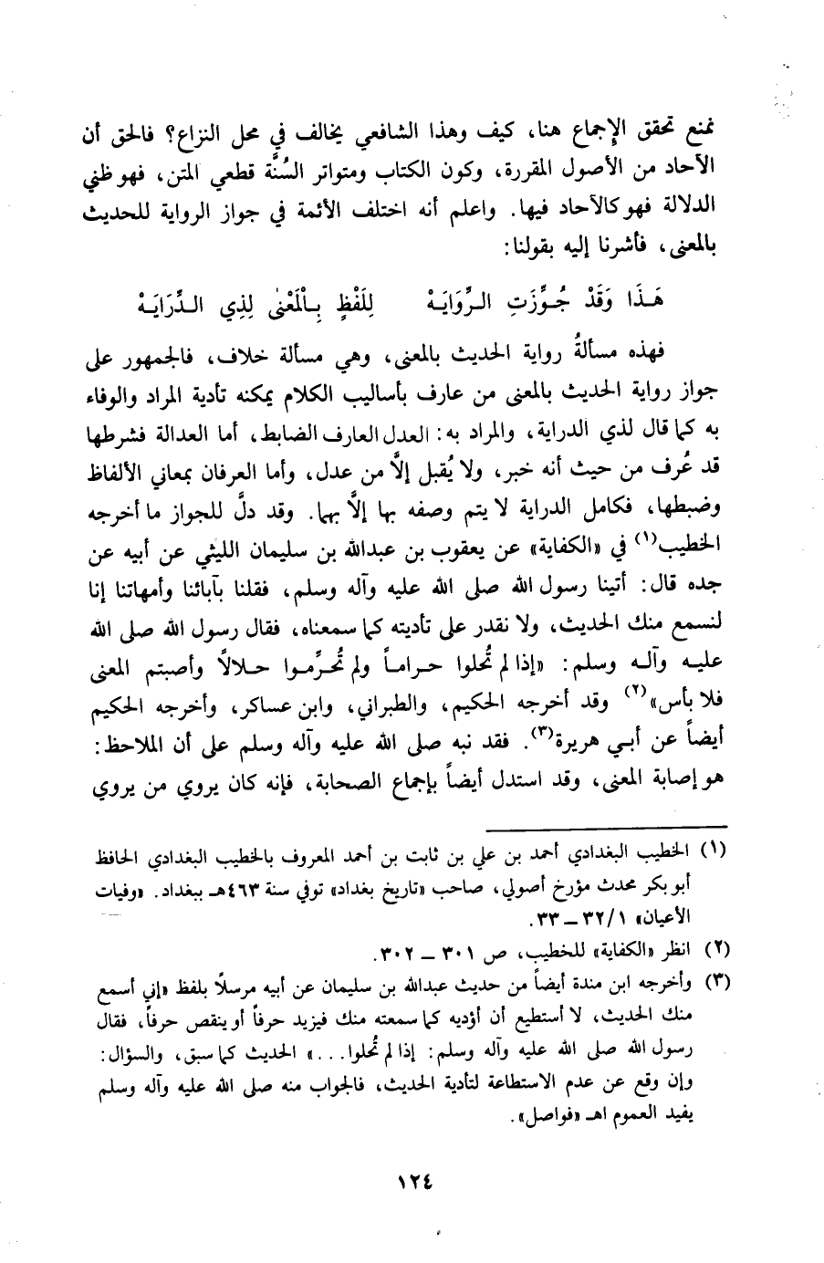فَهَذِهِ مَسْأَلَة رِوَايَة الحَدِيث بِالْمَعْنَى وَهِي مَسْأَلَة خلاف فالجمهور على جَوَاز رِوَايَة الحَدِيث بِالْمَعْنَى من عَارِف بأساليب الْكَلَام يُمكنهُ تأدية المُرَاد وَالْوَفَاء بِهِ كَمَا قَالَ لذِي الدِّرَايَة وَالْمرَاد بِهِ الْعدْل الْعَارِف الضَّابِط أما الْعَدَالَة فشرطها قد عرف من حَيْثُ أَنه خبر وَلَا يقبل إِلَّا من عدل وَأما الْعرْفَان بمعاني الْأَلْفَاظ وضبطها فكامل الدِّرَايَة لَا يتم وَصفه بهَا إِلَّا بهما وَقد دلّ للْجُوَاز مَا أخرجه الْخَطِيب فِي الْكِفَايَة عَن يَعْقُوب بن عبد الله بن سُلَيْمَان اللَّيْثِيّ عَن أَبِيه عَن جده قَالَ أَتَيْنَا رَسُول الله صلى الله عَلَيْهِ وَسلم فَقُلْنَا بِآبَائِنَا وَأُمَّهَاتنَا إِنَّا لنسمع مِنْك الحَدِيث وَلَا نقدر على تأديته كَمَا سمعناه فَقَالَ رَسُول الله صلى الله عَلَيْهِ وَسلم إِذا لم تحلوا حَرَامًا وَلم تحرموا حَلَالا وأصبتم الْمَعْنى فَلَا بَأْس وَقد أخرجه الْحَكِيم وَالطَّبَرَانِيّ وَابْن عَسَاكِر وَأخرجه الْحَكِيم أَيْضا عَن أبي هُرَيْرَة فقد نبه صلى الله عَلَيْهِ وَسلم على أَن الملاحظ هُوَ إِصَابَة الْمَعْنى وَقد اسْتدلَّ أَيْضا بِإِجْمَاع الصَّحَابَة فَإِنَّهُ كَانَ يروي من يروي