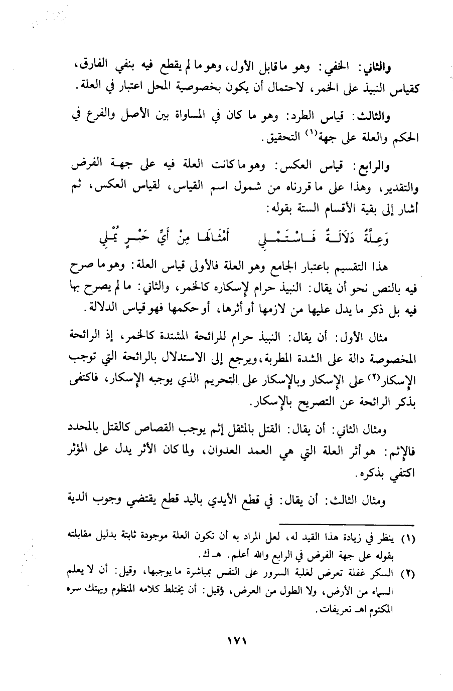 مِثَال الأول أَن يُقَال النَّبِيذ حرَام للرائحة المشتدة كَالْخمرِ إِذْ الرَّائِحَة الْمَخْصُوصَة دَالَّة على الشدَّة المطربة وَيرجع إِلَى الِاسْتِدْلَال بالرائحة الَّتِي توجب الْإِسْكَار على الْإِسْكَار وبالإسكار على التَّحْرِيم الَّذِي يُوجِبهُ الْإِسْكَار فَاكْتفى بِذكر الرَّائِحَة عَن التَّصْرِيح بالإسكار