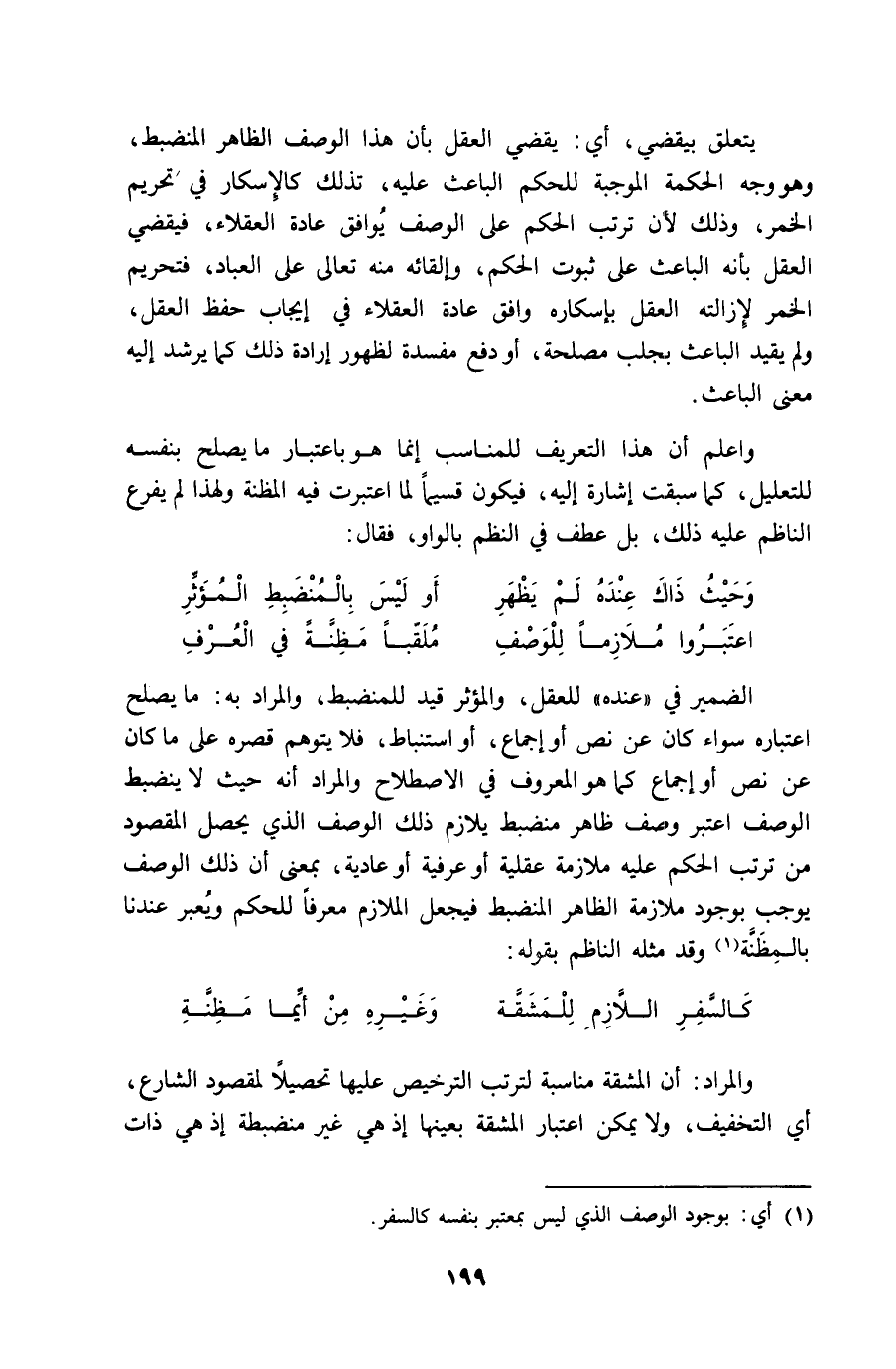 وَاعْلَم أَن هَذَا التَّعْرِيف للمناسب إِنَّمَا هُوَ بِاعْتِبَار مَا يصلح بِنَفسِهِ للتَّعْلِيل كَمَا سبقت إِشَارَة إِلَيْهِ فَيكون قسيما لما اعْتبرت فِيهِ المظنة وَلِهَذَا لم يفرع النَّاظِم عَلَيْهِ ذَلِك بل عطف فِي النّظم بِالْوَاو فَقَالَ