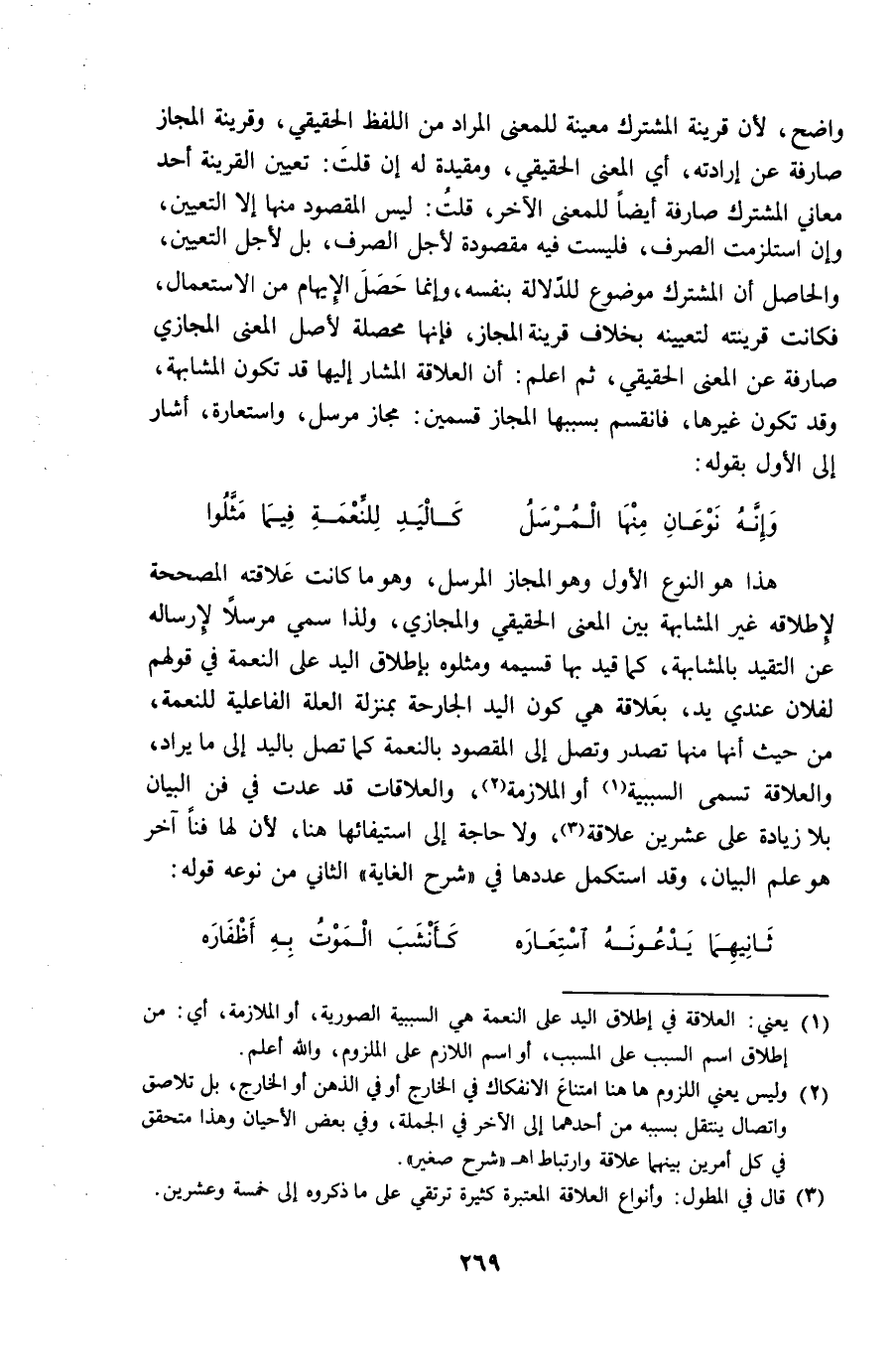 هَذَا هُوَ النَّوْع الأول وَهُوَ الْمجَاز الْمُرْسل وَهُوَ مَا كَانَت علاقته المصححة لإطلاقه غير المشابهة بَين الْمَعْنى الْحَقِيقِيّ والمجازي وَلذَا سمي مُرْسلا لإرساله عَن التَّقْيِيد بالمشابهة كَمَا قيد بهَا قسيمه ومثلوه بِإِطْلَاق الْيَد على النِّعْمَة فِي قَوْلهم لفُلَان عِنْدِي يَد بعلاقة هِيَ كَون الْيَد الْجَارِحَة بِمَنْزِلَة الْعلَّة الفاعلية للنعمة من حَيْثُ أَنَّهَا مِنْهَا تصدر وَتصل إِلَى الْمَقْصُود بِالنعْمَةِ كَمَا تصل بِالْيَدِ إِلَى مَا يُرَاد والعلاقة تسمى السَّبَبِيَّة أَو الْمُلَازمَة والعلاقات قد عدت فِي فن الْبَيَان بِلَا زِيَادَة على عشْرين علاقَة وَلَا حَاجَة إِلَى استيفائها هُنَا لِأَن لَهَا فَنًّا آخر هُوَ علم الْبَيَان وَقد اسْتكْمل عَددهَا فِي شرح الْغَايَة الثَّانِي من نَوعه قَوْله ... ثَانِيهمَا يَدعُونَهُ استعاره ... كأنشب الْمَوْت بِهِ أَظْفَاره ...