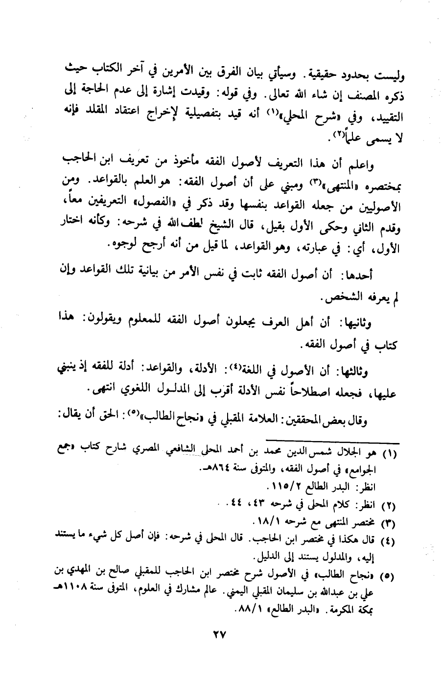 وَاعْلَم ان هَذَا التَّعْرِيف لأصول الْفِقْه مَأْخُوذ من تَعْرِيف ابْن الْحَاجِب بمختصره الْمُنْتَهى ومبني على أَن أصُول الْفِقْه هُوَ الْعلم بالقواعد وَمن الْأُصُولِيِّينَ من جعله الْقَوَاعِد بِنَفسِهَا وَقد ذكر فِي الْفُصُول التعريفين مَعًا وَقدم الثَّانِي وَحكى الأول بقيل قَالَ الشَّيْخ لطف الله فِي شَرحه وَكَأَنَّهُ اخْتَار الأول أَي فِي عِبَارَته وَهُوَ الْقَوَاعِد لما قيل من أَنه أرجح لوجوه