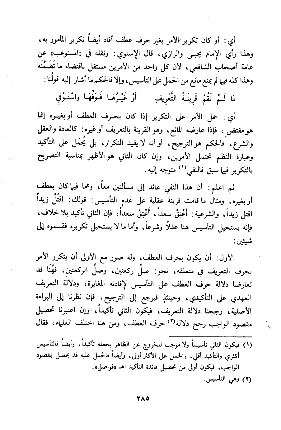 الأول أَن يكون بِحرف الْعَطف وَله صور مَعَ الأولى أَن يتَكَرَّر الْأَمر بِحرف التَّعْرِيف فِي مُتَعَلّقه نَحْو صل رَكْعَتَيْنِ وصل الرَّكْعَتَيْنِ فَهُنَا قد تَعَارضا دلَالَة حرف الْعَطف على التأسيس لإفادته الْمُغَايرَة وَدلَالَة التَّعْرِيف العهدي على التأكيدي وَحِينَئِذٍ فَيرجع إِلَى التَّرْجِيح فَإِن نَظرنَا إِلَى الْبَرَاءَة الْأَصْلِيَّة رجحنا دلَالَة التَّعْرِيف فَيكون الثَّانِي تَأْكِيدًا وَإِن اعْتبرنَا تَحْصِيل مَقْصُود الْوَاجِب رجح دلَالَة حرف الْعَطف وَمن هُنَا اخْتلف الْعلمَاء فَقَالَ