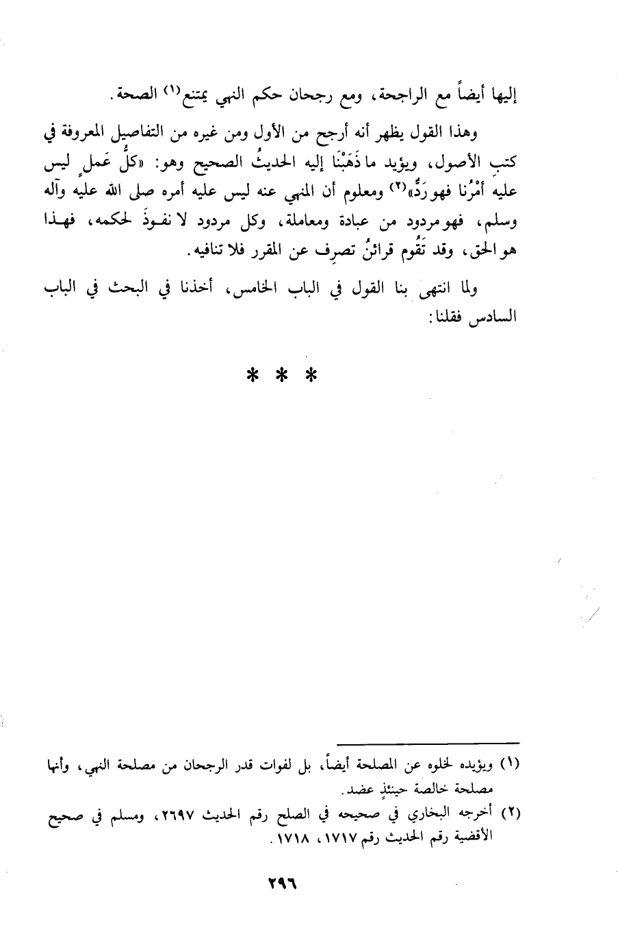 وَهَذَا القَوْل يظْهر أَنه أرجح من الأول وَمن غَيره من التفاصيل الْمَعْرُوفَة فِي كتب الْأُصُول وَيُؤَيّد مَا ذَهَبْنَا إِلَيْهِ الحَدِيث الصَّحِيح وَهُوَ كل عمل لَيْسَ عَلَيْهِ أمرنَا فَهُوَ رد وَمَعْلُوم أَن الْمنْهِي عَنهُ لَيْسَ عَلَيْهِ أمره صلى الله عَلَيْهِ وَسلم فَهُوَ مَرْدُود من عبَادَة ومعاملة وكل مَرْدُود لَا نُفُوذ لحكمه فَهَذَا هُوَ الْحق وَقد تقوم قَرَائِن تصرف عَن الْمُقَرّر فَلَا تنافيه