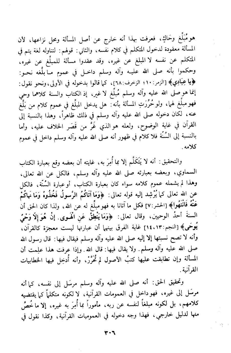 وَالتَّحْقِيق أَنه لَا يتَكَلَّم إِلَّا بِمَا أَمر بِهِ غَايَته أَن بعضه وَقع بِعِبَارَة الْكتاب السماوي وَبَعضه بعبارته صلى الله عَلَيْهِ وَسلم فَالْكل عَن الله تَعَالَى وَهَذَا لم يَشْمَلهُ عُمُوم كَلَامه سَوَاء كَانَ بِعِبَارَة الْكتاب أَو عبارَة السّنة فَالْكل عَن الله تَعَالَى كَمَا يرشد إِلَيْهِ قَوْله تَعَالَى {وَمَا آتَاكُم الرَّسُول فَخُذُوهُ وَمَا نهاكم عَنهُ فَانْتَهوا} فَكل مَا آتَانَا بِهِ فَهُوَ مبلغ لَهُ عَن الله وَلذَا كَانَ الْحق أَن السّنة أحد الوحيين وَقَالَ تَعَالَى {وَمَا ينْطق عَن الْهوى إِن هُوَ إِلَّا وَحي يُوحى} غَايَة الْفرق بَينهمَا أَن عبارتها لَيْسَ معْجزَة كالقرآن وَأَنه لَا تصح نسبتها إِلَّا إِلَيْهِ صلى الله عَلَيْهِ وَسلم فَيُقَال فِيهَا قَالَ رَسُول الله صلى الله عَلَيْهِ وَسلم وَلَا يُقَال فِيهَا قَالَ الله وَإِذا عرفت هَذَا علمت أَن الْمَسْأَلَة وَإِن تطابقت عَلَيْهَا كتب الْأُصُول لم تحرر وَأَنه أَدخل فِيهَا الخطابيات القرآنية