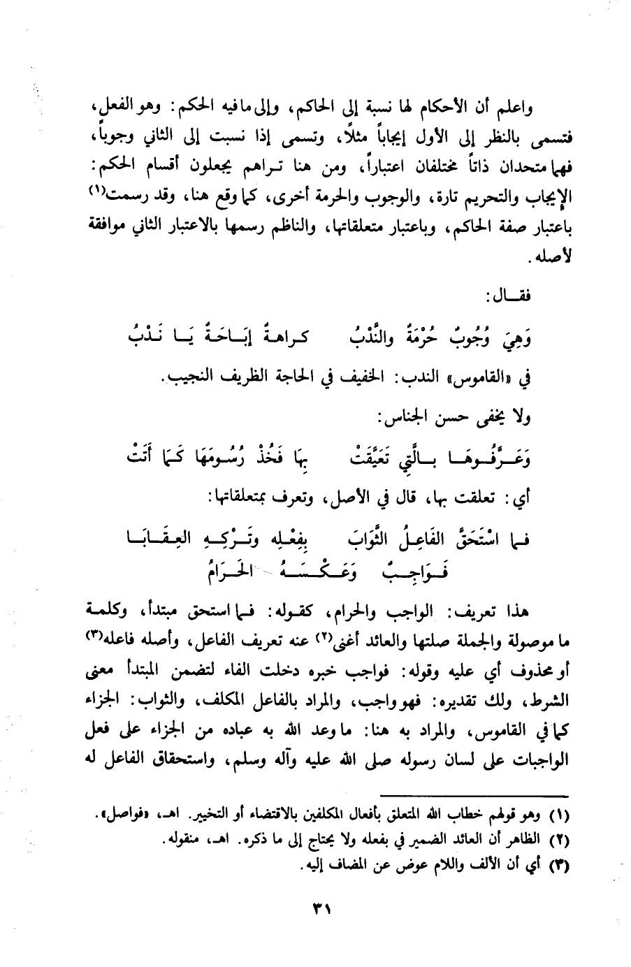 وَاعْلَم أَن الْأَحْكَام لَهَا نِسْبَة إِلَى الْحَاكِم وَإِلَى مَا فِيهِ الحكم وَهُوَ الْفِعْل فتسمى بِالنّظرِ إِلَى الأول إِيجَابا مثلا وَتسَمى إِذا نسبت إِلَى الثَّانِي وجوبا فهما متحدان ذاتا مُخْتَلِفَانِ اعْتِبَارا وَمن هُنَا تراهم يجْعَلُونَ أَقسَام الحكم الْإِيجَاب وَالتَّحْرِيم تَارَة وَالْوُجُوب وَالْحُرْمَة أُخْرَى كَمَا وَقع هُنَا وَقد رسمت باعبتار صفة الْحَاكِم وَبِاعْتِبَار متعلقاتها والناظم رسمها بِالِاعْتِبَارِ الثَّانِي مُوَافقَة لأصله