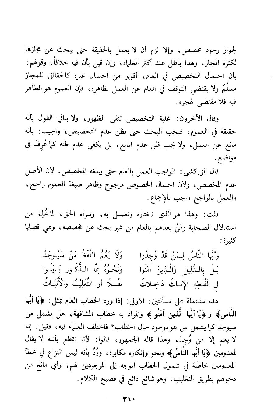 هَذِه مُشْتَمِلَة على مَسْأَلَتَيْنِ الأولى إِذا ورد الْخطاب الْعَام بِمثل {يَا أَيهَا النَّاس} و {يَا أَيهَا الَّذين آمنُوا} وَالْمرَاد بِهِ خطاب المشافهة هَل يَشْمَل من سيوجد كَمَا يَشْمَل من هُوَ مَوْجُود حَال الْخطاب فَاخْتلف الْعلمَاء فِيهِ فَقيل إِنَّه لَا يعم إِلَّا من وجد وَهَذَا قَالَه الْجُمْهُور قَالُوا لأَنا نقطع بِأَنَّهُ لَا يُقَال لمعدومين {يَا أَيهَا النَّاس} وَنَحْو وإنكاره مُكَابَرَة ورد بِأَنَّهُ لَيْسَ النزاع فِي خطأ المعدومين خَاصَّة فِي شُمُول الْخطاب الموجه إِلَى الْمَوْجُودين لَهُم وَأي مَانع من دُخُولهمْ بطرِيق التغليب وَهُوَ شَائِع ذائع فِي فصيح الْكَلَام