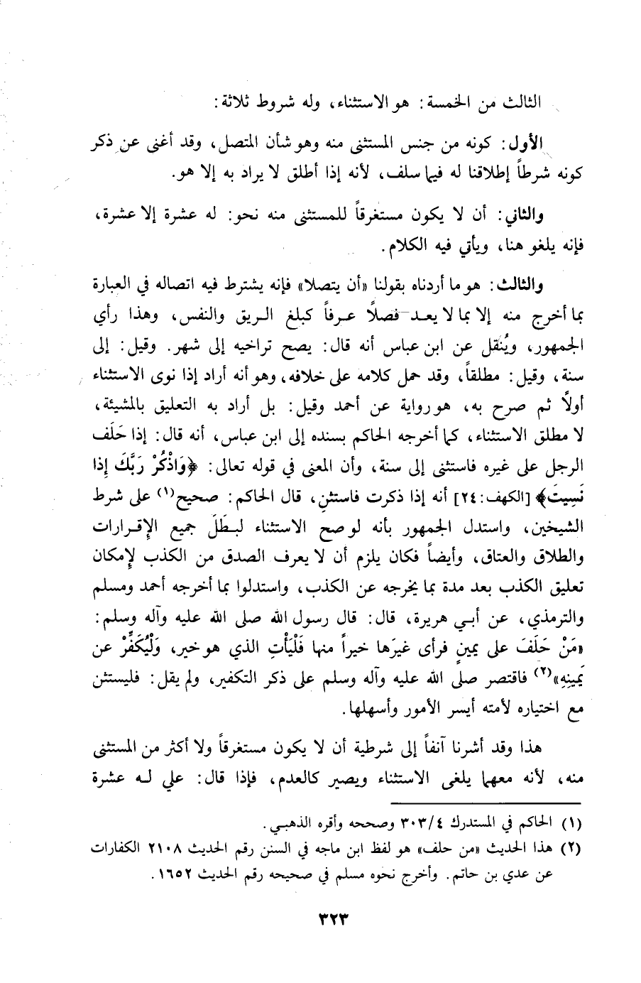 وَالثَّالِث هُوَ مَا أردناه بقولنَا أَن يتصلا فَإِنَّهُ يشْتَرط فِيهِ اتِّصَاله فِي الْعبارَة بِمَا أخرج مِنْهُ إِلَّا بِمَا لَا يعد فصلا عرفا كبلع الرِّيق وَالنَّفس وَهَذَا رَأْي الْجُمْهُور وينقل عَن ابْن عَبَّاس أَنه قَالَ يَصح تراخيه إِلَى شهر وَقيل إِلَى سنة وَقيل مُطلقًا وَقد حمل كَلَامه على خِلَافه وَهُوَ أَنه أَرَادَ إِذا نوى الِاسْتِثْنَاء أَولا ثمَّ صرح بِهِ هُوَ رِوَايَة عَن أَحْمد وَقيل بل أَرَادَ بِهِ التَّعْلِيق بِالْمَشِيئَةِ لَا مُطلق الِاسْتِثْنَاء كَمَا أخرجه الْحَاكِم بِسَنَدِهِ إِلَى ابْن عَبَّاس أَنه قَالَ إِذا حلف الرجل على غَيره فاستثنى إِلَى سنة وَأَن الْمَعْنى فِي قَوْله تَعَالَى {وَاذْكُر رَبك إِذا نسيت} أَنه إِذا ذكرت فَاسْتَثْنِ قَالَ الْحَاكِم صَحِيح على شَرط الشَّيْخَيْنِ وَاسْتدلَّ الْجُمْهُور بِأَنَّهُ لَو صَحَّ الِاسْتِثْنَاء لبطل جَمِيع الإقرارات وَالطَّلَاق وَالْعتاق وَأَيْضًا فَكَانَ يلْزم أَن لَا يعرف الصدْق من الْكَذِب لِإِمْكَان تَعْلِيق الْكَذِب بعد مُدَّة بِمَا يُخرجهُ عَن الْكَذِب وَاسْتَدَلُّوا بِمَا أخرجه أَحْمد وَمُسلم وَالتِّرْمِذِيّ عَن أبي هُرَيْرَة قَالَ قَالَ رَسُول الله صلى الله عَلَيْهِ وَسلم من حلف على يَمِين فَرَأى غَيرهَا خيرا مِنْهَا فليأت الَّذِي هُوَ خير وليكفر عَن يَمِينه فاقتصر صلى الله عَلَيْهِ وَسلم على ذكر التَّكْفِير وَلم يقل فليستثن مَعَ اخْتِيَاره لأمته أيسر الْأُمُور وأسهلها