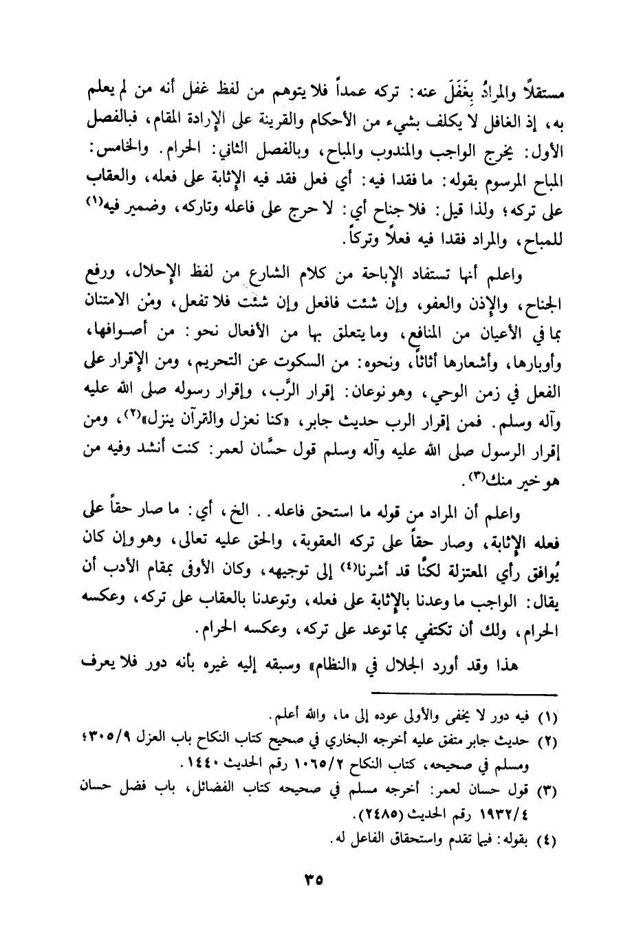مُسْتقِلّا وَالْمرَاد بغفل عَنهُ تَركه عمدا فَلَا يتَوَهَّم من لفظ غفل أَنه من لم يعلم بِهِ إِذْ الغافل لَا يُكَلف بِشَيْء من الْأَحْكَام والقرينة على الْإِرَادَة الْمقَام فبالفصل الأول يخرج الْوَاجِب وَالْمَنْدُوب والمباح وبالفصل الثَّانِي الْحَرَام وَالْخَامِس الْمُبَاح المرسوم بقوله مَا فقدا فِيهِ أَي فعل فقد فِيهِ الإثابة على فعله وَالْعِقَاب على تَركه وَلذَا قيل فَلَا جنَاح أَي لَا حرج على فَاعله وتاركه وَضمير فِيهِ للمباح وَالْمرَاد فقدا فِيهِ فعلا وتركا