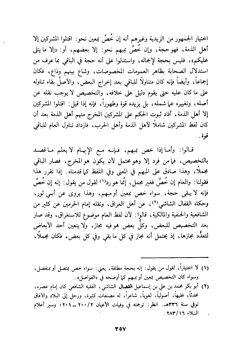 قَالُوا وَأما إِذا خص بمبهم فَإِنَّهُ مَعَ الْإِبْهَام لَا يعلم مَا قصد بالتخصيص فَمَا من فَرد إِلَّا وَهُوَ مُحْتَمل لِأَن يكون هُوَ الْمخْرج فَصَارَ الْبَاقِي مُجملا وَهَذَا صَادِق على الْمُبْهم فِي الْمَعْنى وَفِي اللَّفْظ كَمَا قدمْنَاهُ إِذا تقرر هَذَا فقولنا وَالْعَام إِن خص فَغير مُجمل إِنَّمَا هُوَ رد لقَوْل من يَقُول إِنَّه إِن خص فَإِنَّهُ لَا يبْقى حجَّة سَوَاء خص بِمعين أَو مُبْهَم وَهَذَا يرْوى عَن أبي ثَوْر وَحَكَاهُ الْقفال الشَّاشِي عَن أهل الْعرَاق وَنَقله إِمَام الْحَرَمَيْنِ عَن كثير من الشَّافِعِيَّة وَالْحَنَفِيَّة والمالكية قَالُوا لِأَن لفظ الْعَام مَوْضُوع للاستغراق وَقد صَار بعد التَّخْصِيص للْبَعْض وكل بعض هُوَ فِيهِ مجَاز وَلَا يتَعَيَّن أحد الأبعاض لتَعَدد مجازها إِذْ يحْتَمل أَنه مجَاز فِي كل مَا بَقِي وَفِي كل بعض فَكَانَ مُجملا