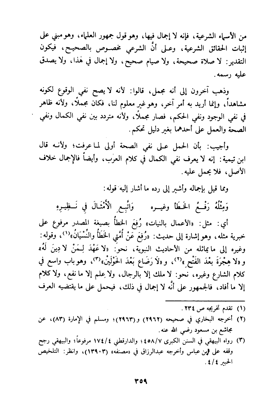 وَذهب آخَرُونَ إِلَى أَنه مُجمل قَالُوا لِأَنَّهُ لَا يَصح نفي الْوُقُوع لكَونه مشاهدا وَإِنَّمَا أُرِيد بِهِ أَمر آخر وَهُوَ غير مَعْلُوم لنا فَكَانَ مُجملا وَلِأَنَّهُ ظَاهر فِي نفي الْوُجُود وَنفي الحكم فَصَارَ مُجملا وَلِأَنَّهُ مُتَرَدّد بَين نفى الْكَمَال وَنفى الصِّحَّة وَالْعَمَل على أَحدهمَا بِغَيْر دَلِيل تحكم