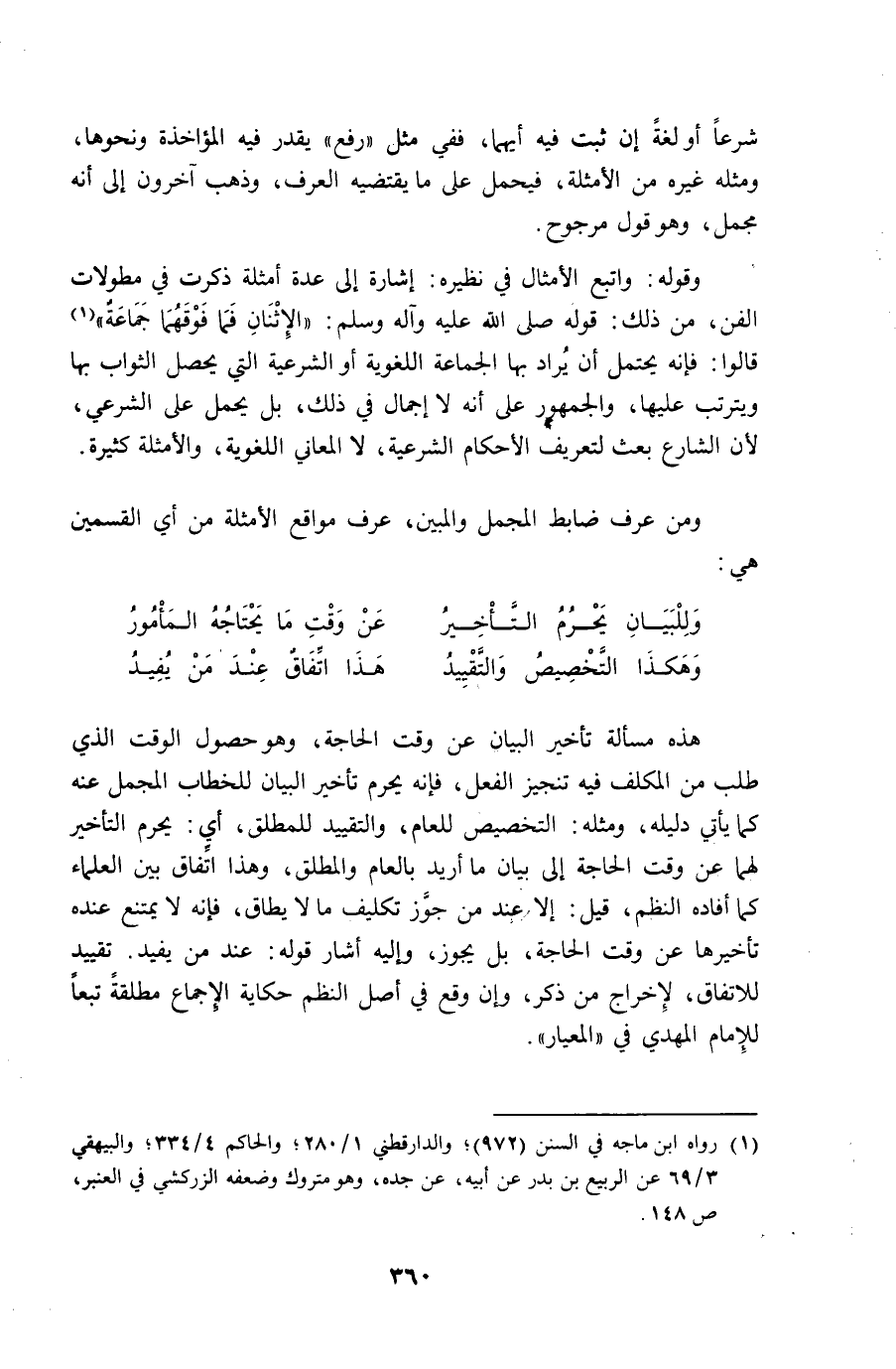 وَقَوله وَاتبع الْأَمْثَال فِي نَظِيره إِشَارَة إِلَى عدَّة أَمْثِلَة ذكرت فِي مطولات الْفَنّ من ذَلِك قَوْله صلى الله عَلَيْهِ وَسلم الإثنان فَمَا فَوْقهمَا جمَاعَة قَالُوا فَإِنَّهُ يحْتَمل أَن يُرَاد بهَا الْجَمَاعَة اللُّغَوِيَّة أَو الشَّرْعِيَّة الَّتِي يحصل الثَّوَاب بهَا وَيَتَرَتَّب عَلَيْهَا وَالْجُمْهُور على أَنه لَا إِجْمَال فِي ذَلِك بل يحمل على الشَّرْعِيّ لِأَن الشَّارِع بعث لتعريف الْأَحْكَام الشَّرْعِيَّة لَا الْمعَانِي اللُّغَوِيَّة والأمثلة كَثِيرَة