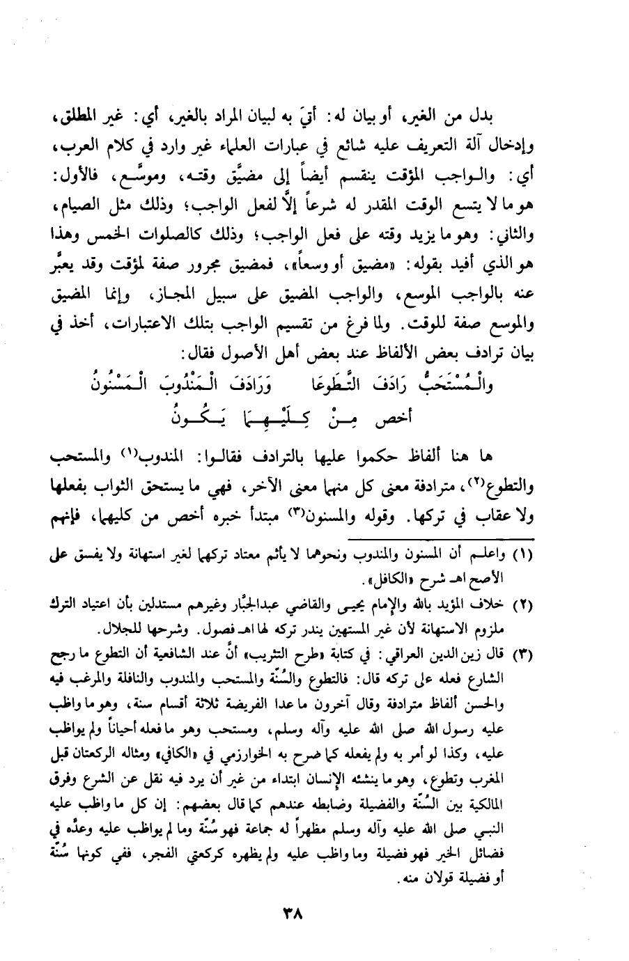 بدل من الْغَيْر أَو بَيَان لَهُ أُتِي بِهِ لبَيَان المُرَاد بِالْغَيْر أَي غير الْمُطلق وَإِدْخَال آلَة التَّعْرِيف عَلَيْهِ شَائِع فِي عِبَارَات الْعلمَاء غير وَارِد فِي كَلَام الْعَرَب أَي وَالْوَاجِب الْمُؤَقت يَنْقَسِم أَيْضا إِلَى مضيق وقته وموسع فَالْأول هُوَ مَا لَا يَتَّسِع الْوَقْت الْمُقدر لَهُ شرعا إِلَّا لفعل الْوَاجِب وَذَلِكَ مثل الصّيام وَالثَّانِي وَهُوَ مَا يزِيد وقته على فعل الْوَاجِب وَذَلِكَ كالصلوات الْخمس وَهَذَا هُوَ الَّذِي أفيد بقوله مضيق اَوْ وسعا فمضيق مجرور صفة لمؤقت وَقد يعبر عَنهُ بِالْوَاجِبِ الموسع وَالْوَاجِب الْمضيق على سَبِيل الْمجَاز وَإِنَّمَا الْمضيق والموسع صفة للْوَقْت وَلما فرغ من تَقْسِيم الْوَاجِب بِتِلْكَ الاعتبارات أَخذ فِي بَيَان ترادف بعض الْأَلْفَاظ عِنْد بعض أهل الْأُصُول فَقَالَ