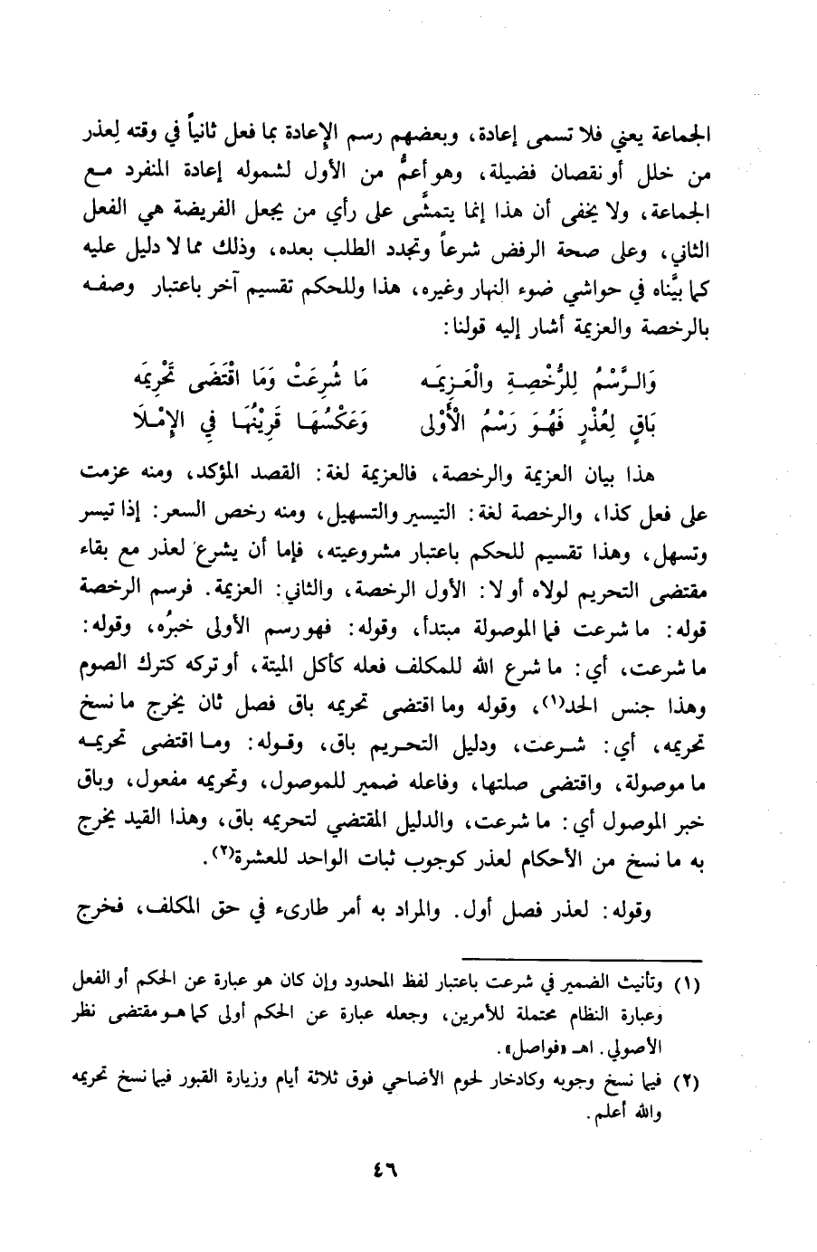 هَذَا بَيَان الْعَزِيمَة والرخصة فالعزيمة لُغَة الْقَصْد الْمُؤَكّد وَمِنْه عزمت على فعل كَذَا والرخصة لُغَة التَّيْسِير والتسهيل وَمِنْه رخص السّعر إِذا تيَسّر وتسهل وَهَذَا تَقْسِيم للْحكم بِاعْتِبَار مشروعيته فإمَّا أَن يشرع لعذر مَعَ بَقَاء مُقْتَضى التَّحْرِيم لولاه أَو لَا الأول الرُّخْصَة وَالثَّانِي الْعَزِيمَة فرسم الرُّخْصَة قَوْله مَا شرعت فَمَا الموصولة مُبْتَدأ وَقَوله فَهُوَ رسم الأولى خَبره وَقَوله مَا شرعت أَي مَا شرع الله للمكلف فعله كَأَكْل الْميتَة أَو تَركه كَتَرْكِ الصَّوْم وَهَذَا جنس الْحَد وَقَوله وَمَا اقْتضى تَحْرِيمه بَاقٍ فصل ثَان يخرج مَا نسخ تَحْرِيمه أَي شرعت وَدَلِيل التَّحْرِيم بَاقٍ وَقَوله وَمَا اقْتضى تَحْرِيمه مَا مَوْصُولَة وَاقْتضى صلتها وفاعله ضمير للموصول وتحريمه مفعول وباق خبر الْمَوْصُول أَي مَا شرعت وَالدَّلِيل الْمُقْتَضِي لتحريمه بَاقٍ وَهَذَا الْقَيْد يخرج بِهِ مَا نسخ من الْأَحْكَام لعذر كوجوب ثبات الْوَاحِد للعشرة