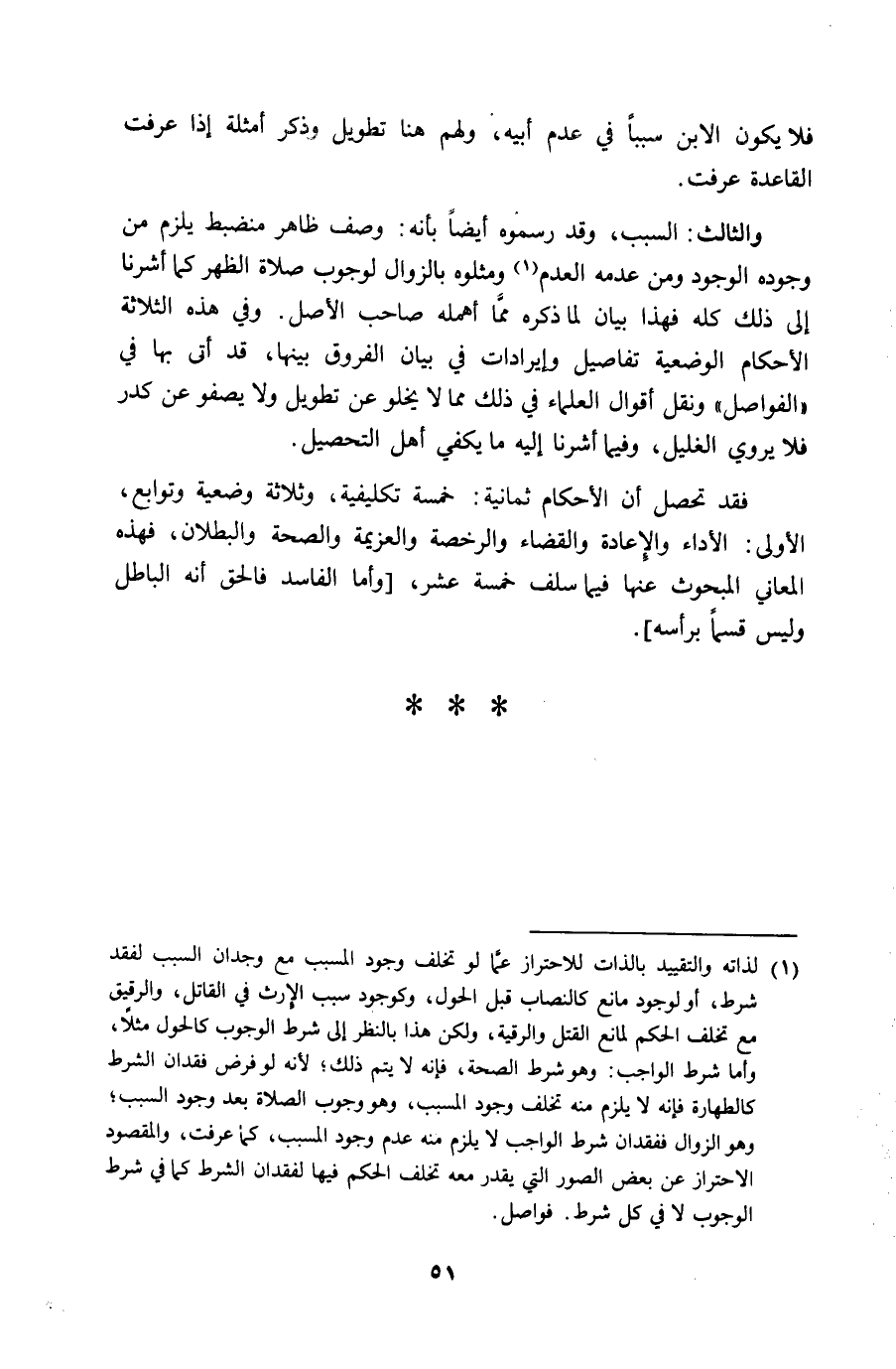 الثَّالِث السَّبَب وَقد رسموه أَيْضا بِأَنَّهُ وصف ظَاهر منضبط يلْزم من وجوده الْوُجُود وَمن عَدمه الْعَدَم ومثلوه بالزوال لوُجُوب صَلَاة الظّهْر كَمَا أَشَرنَا إِلَى ذَلِك كُله فَهَذَا بَيَان لما ذكره مِمَّا أهمله صَاحب الأَصْل وَفِي هَذِه الثَّلَاثَة الْأَحْكَام الوضعية تفاصيل وإيرادات فِي بَيَان الفروق بَينهَا قد أَتَى بهَا فِي الفواصل وَنقل أَقْوَال الْعلمَاء فِي ذَلِك مِمَّا لَا يَخْلُو عَن تَطْوِيل وَلَا يصفو عَن كدر فَلَا يرْوى الغليل وَفِيمَا أَشَرنَا إِلَيْهِ مَا يَكْفِي أهل التَّحْصِيل