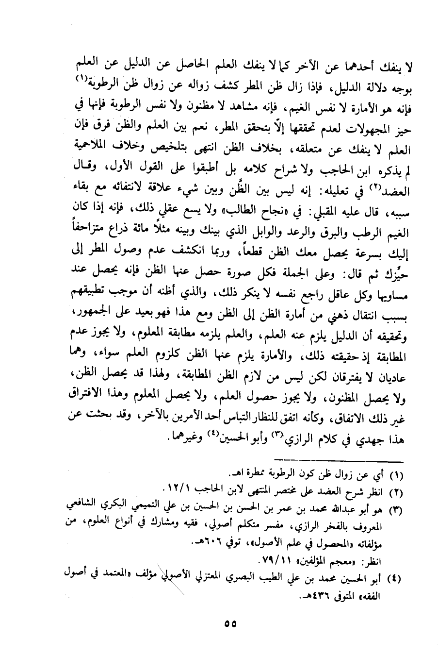 لَا يَنْفَكّ أَحدهمَا عَن الآخر كَمَا لَا يَنْفَكّ الْعلم الْحَاصِل عَن الدَّلِيل عَن الْعلم بِوَجْه دلَالَة الدَّلِيل فَإِذا زَالَ ظن الْمَطَر كشف زَوَاله عَن زَوَال ظن الرُّطُوبَة فَإِنَّهُ هُوَ الأمارة لَا نفس الْغَيْم فَإِنَّهُ مشَاهد لَا مظنون وَلَا نفس الرُّطُوبَة فَإِنَّهَا فِي حيّز المجهولات لعدم تحققها إِلَّا بتحقق الْمَطَر نعم بَين الْعلم وَالظَّن فرق فَإِن الْعلم لَا يَنْفَكّ عَن مُتَعَلّقه بِخِلَاف الظَّن انْتهى بتلخيص وَخلاف الملاحمية لم يذكرهُ ابْن الْحَاجِب وَلَا شرَّاح كَلَامه بل أطبقوا على القَوْل الأول وَقَالَ الْعَضُد فِي تَعْلِيله إِنَّه لَيْسَ بَين الظَّن وَبَين شَيْء علاقَة لانتفائه مَعَ بَقَاء سَببه قَالَ عَلَيْهِ المقبلي فِي نجاح الطَّالِب وَلَا يسع عَقْلِي ذَلِك فَإِنَّهُ إِذا كَانَ الْغَيْم الرطب والبرق والرعد والوابل الَّذِي بَيْنك وَبَينه مثلا مائَة ذِرَاع متزاحفا إِلَيْك بِسُرْعَة يحصل مَعَك الظَّن قطعا وَرُبمَا انْكَشَفَ عدم وُصُول الْمَطَر إِلَى حيزك ثمَّ قَالَ وعَلى الْجُمْلَة فَكل صُورَة حصل عَنْهَا الظَّن فَإِنَّهُ يحصل عِنْد مساويها وكل عَاقل رَاجع نَفسه لَا يُنكر ذَلِك وَالَّذِي أَظُنهُ أَن مُوجب تطبيقهم بِسَبَب انْتِقَال ذهني من أَمارَة الظَّن إِلَى الظَّن وَمَعَ هَذَا فَهُوَ بعيد على الْجُمْهُور وتحقيقه أَن الدَّلِيل يلْزم عَنهُ الْعلم وَالْعلم يلْزمه مُطَابقَة الْمَعْلُوم وَلَا يجوز عدم الْمُطَابقَة إِذْ حَقِيقَته ذَلِك والأمارة يلْزم عَنْهَا الظَّن كلزوم الْعلم سَوَاء وهما عاديان لَا يفترقان لَكِن لَيْسَ من لَازم الظَّن الْمُطَابقَة وَلِهَذَا قد يحصل الظَّن وَلَا يحصل المظنون وَلَا يجوز حُصُول الْعلم وَلَا يحصل الْمَعْلُوم وَهَذَا الِافْتِرَاق غير ذَلِك الِاتِّفَاق وَكَأَنَّهُ اتّفق للنظار التباس أحد الْأَمريْنِ بِالْآخرِ وَقد بحثت عَن هَذَا جهدي فِي كَلَام الرَّازِيّ وَأَبُو الْحُسَيْن وَغَيرهمَا