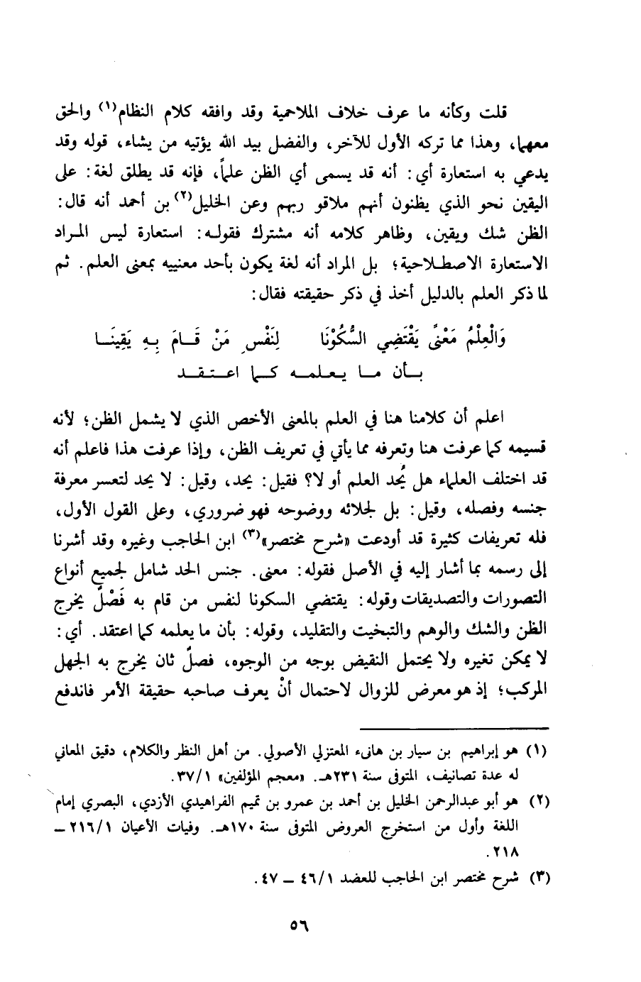 اعْلَم أَن كلامنا هُنَا فِي الْعلم بِالْمَعْنَى الْأَخَص الَّذِي لَا يَشْمَل الظَّن لِأَنَّهُ قسيمه كَمَا عرفت هُنَا وتعرفه مِمَّا يَأْتِي فِي تَعْرِيف الظَّن وَإِذا عرفت هَذَا فَاعْلَم أَنه قد اخْتلف الْعلمَاء هَل يحد الْعلم أَو لَا فَقيل يحد وَقيل لَا يحد لتعسر معرفَة جنسه وفصله وَقيل بل لجلائه ووضوحه فَهُوَ ضَرُورِيّ وعَلى القَوْل الأول فَلهُ تعريفات كَثِيرَة قد أودعت شرح مُخْتَصر ابْن الْحَاجِب وَغَيره وَقد أَشَرنَا إِلَى رسمه بِمَا أَشَارَ إِلَيْهِ فِي الأَصْل فَقَوله معنى جنس الْحَد شَامِل لجَمِيع أَنْوَاع التصورات والتصديقات وَقَوله يَقْتَضِي السكونا لنَفس من قَامَ بِهِ فصل يخرج الظَّن وَالشَّكّ وَالوهم والتبخيت والتقيلد وَقَوله بِأَن مَا يُعلمهُ كَمَا اعْتقد أَي لَا يُمكن تغيره وَلَا يحْتَمل النقيض بِوَجْه من الْوُجُوه فصل ثَان يخرج بِهِ الْجَهْل الْمركب إِذْ هُوَ معرض للزوال لاحْتِمَال أَن يعرف صَاحبه حَقِيقَة الْأَمر فَانْدفع