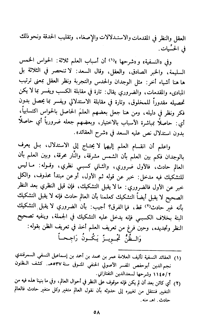 وَفِي النسفية وَشَرحهَا أَن أَسبَاب الْعلم ثَلَاثَة الْحَواس الْخمس السليمة وَالْخَبَر الصَّادِق وَالْعقل وَقَالَ السعد لَا تَنْحَصِر فِي الثَّلَاثَة بل هَاهُنَا أَشْيَاء أخر مثل الوجدان والحدس والتجربة وَنظر الْعقل بِمَعْنى تَرْتِيب المبادىء والمقدمات والضروري يُقَال تَارَة فِي مُقَابلَة الْكسْب ويفسر بِمَا لَا يكن تَحْصِيله مَقْدُورًا للمخلوق وَتارَة فِي مُقَابلَة الاستدلالي ويفسر بِمَا يحصل بِدُونِ فكر وَنظر فِي دَلِيله وَمن هُنَا جعل بَعضهم الْعلم الْحَاصِل بالحواس اكتسابيا أَي حَاصِلا بِمُبَاشَرَة الْأَسْبَاب بِالِاخْتِيَارِ وَبَعْضهمْ جعله ضَرُورِيًّا أَي حَاصِلا بِدُونِ اسْتِدْلَال نَص عَلَيْهِ السعد فِي شرح العقائد