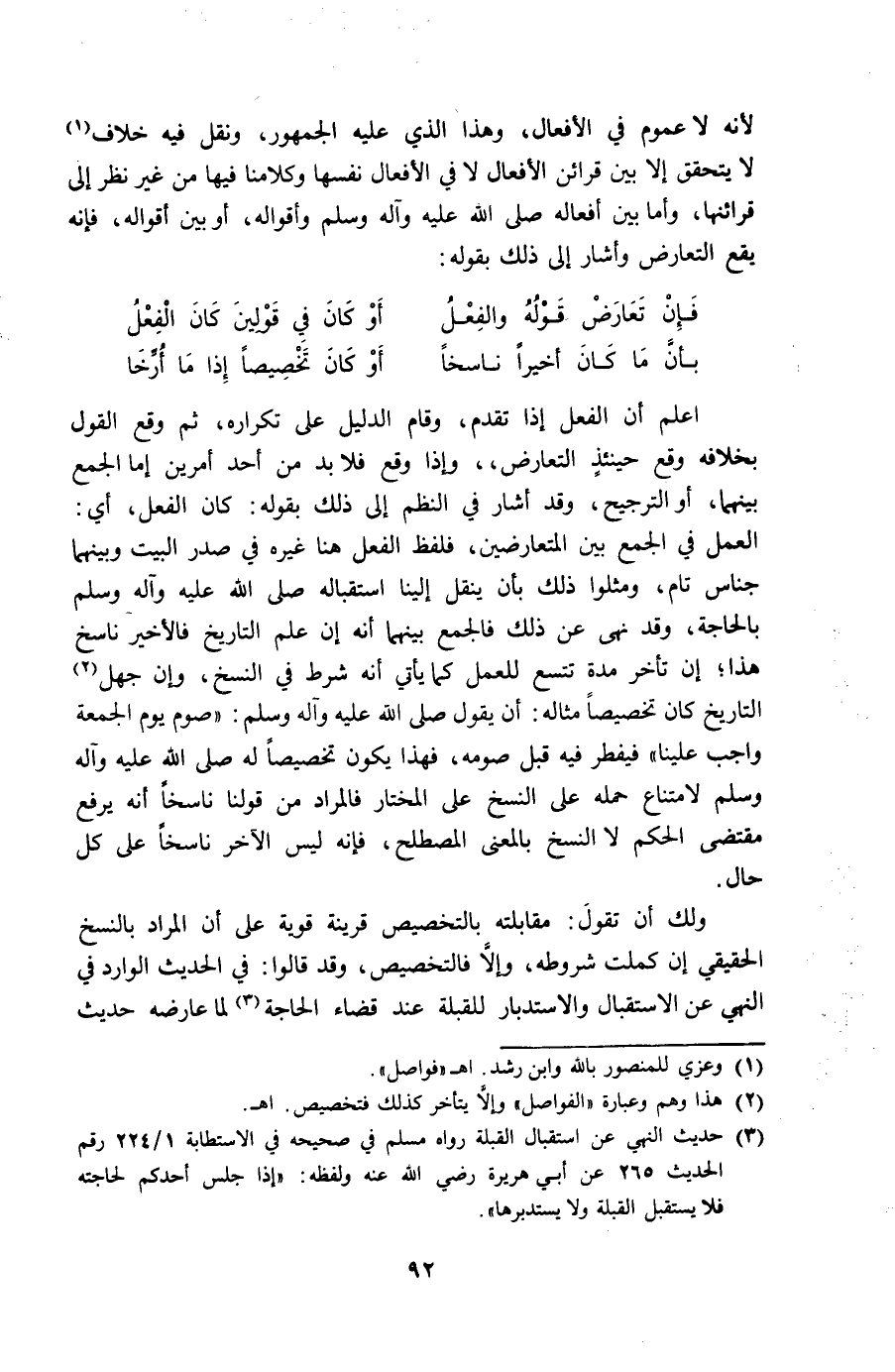 اعْلَم أَن الْفِعْل إِذا تقدم وَقَامَ الدَّلِيل على تكراره ثمَّ وَقع القَوْل بِخِلَافِهِ وَقع حِينَئِذٍ التَّعَارُض وَإِذا وَقع فَلَا بُد من أحد أَمريْن إِمَّا الْجمع بَينهمَا أَو التَّرْجِيح وَقد أَشَارَ فِي النّظم إِلَى ذَلِك بقوله كَانَ الْفِعْل أَي الْعَمَل فِي الْجمع بَين المتعارضين فَلفظ الْفِعْل هُنَا غَيره فِي صدر الْبَيْت وَبَينهمَا جناس تَامّ ومثلوا ذَلِك بِأَن ينْقل إِلَيْنَا استقباله صلى الله عَلَيْهِ وَسلم بِالْحَاجةِ وَقد نهى عَن ذَلِك فالجمع بَينهمَا أَنه إِن علم التَّارِيخ فالأخير نَاسخ هَذَا إِن تَأَخّر مُدَّة تتسع للْعَمَل كَمَا ياتي أَنه شَرط فِي النّسخ وَإِن جهل التَّارِيخ كَانَ تَخْصِيصًا مِثَاله أَن يَقُول صلى الله عَلَيْهِ وَسلم صَوْم يَوْم الْجُمُعَة وَاجِب علينا فيفطر فِيهِ قبل صَوْمه فَهَذَا يكون تَخْصِيصًا لَهُ صلى الله عَلَيْهِ وَسلم لِامْتِنَاع حمله على النّسخ على الْمُخْتَار فَالْمُرَاد من قَوْلنَا نَاسِخا أَنه يرفع مُقْتَضى الحكم لَا النّسخ بِالْمَعْنَى المصطلح فَإِنَّهُ لَيْسَ الآخر نَاسِخا على كل حَال