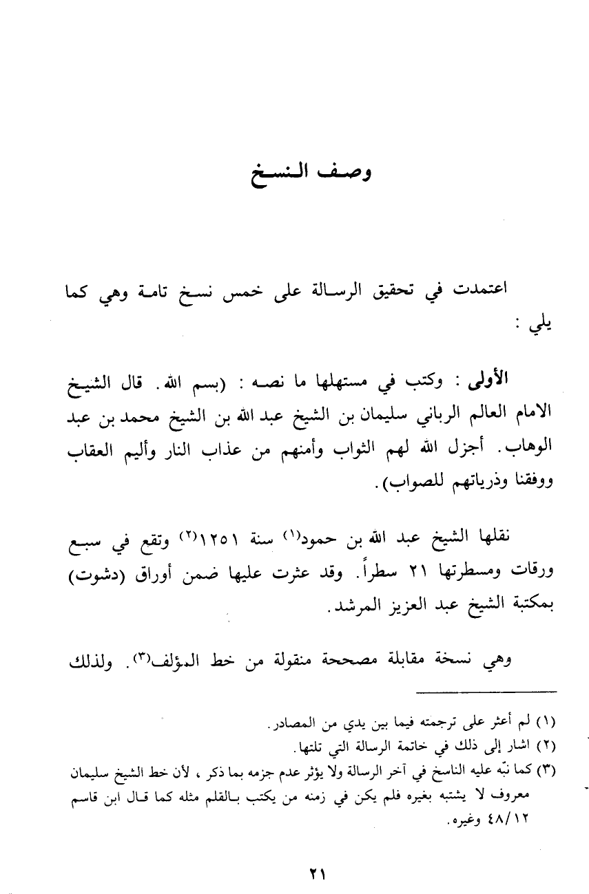 (¬3) كما نبه عليه الناسخ في آخر الرسالة. ولا يمنع عدم جزمه بما ذكر، لأن حظ الشيخ سليمان معروف لا يشتبه بغيره. فلم يكن في زمنه من يكتب بالقلم مثله، كما قال ابن قاسم 12/48 وغيره.