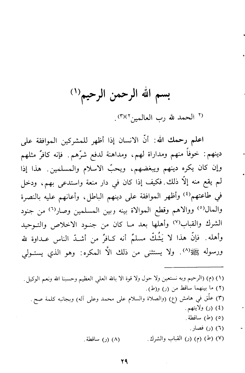 اعلم رحمك الله: أن الإنسان إذا أظهر للمشركين الموافقة على دينهم: خوفاً منهم، ومداراة لهم ومداهنة؛ لدفع شرهم. فإنه كافر مثلهم (¬3) ، وإن كان يكره دينهم ويبغضهم، ويحب الإسلام والمسلمين. هذا إذا لم يقع منه إلا ذلك. فكيف إذا كان في دار منعة، واستدعى بهم، ودخل في طاعتهم (¬4) وأظهر الموافقة على دينهم الباطل، وأعانهم عليه بالنصرة والمال (¬5) ، ووالاهم وقطع الموالاة بينه وبين المسلمين، وصار (¬6) من جنود الشرك والقباب (¬7) وأهلها، بعدما كان من جنود الإخلاص والتوحيد وأهله. فإن هذا لا يشك مسلم أنه كافر، من أشد الناس عداوة لله ورسوله صلى الله عليه وسلم (¬8) . ولا يستثنى من ذلك إلا المكره: وهو الذي يستولي