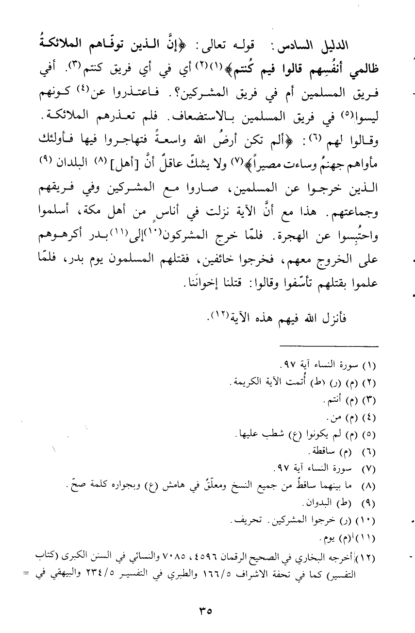 (ألم تكن أرض الله واسعة فتهاجروا فيها فأولئك مأواهم جهنم وساءت مصيراً (¬7) ولا يشك عاقل: أن [أهل] (¬8) البلدان (¬9) الذين خرجوا عن المسلمين، صاروا مع المشركين وفي فريقهم وجماعتهم. هذا مع أن الآية نزلت: في أناس من أهل مكة. أسلموا، واحتبسوا عن الهجرة. فلما خرج المشركون (¬10) إلى (¬11) بدر، أكرهوهم على الخروج معهم، فخرجوا خائفين. فقتلهم المسلمين يوم بدر؛ فلما علموا بقتلهم تأسفوا، وقالوا: قتلنا إخواننا.
