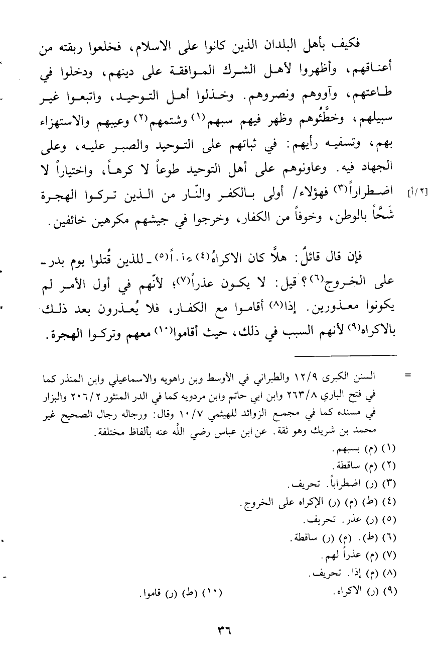 فكيف بأهل البلدان: الذين كانوا على الإسلام، فخلعوا ربقته من أعناقهم، وأظهروا لأهل الشرك الموافقة على دينهم، ودخلوا في طاعتهم، وآووهم ونصروهم، وخذلوا أهل التوحيد، واتبعوا غير سبيلهم، وخطئوهم، وظهر فيهم: سبهم (¬1) ، وشتمهم (¬2) ، وعيبهم، والاستهزاء بهم، وتسفيه رأيهم ـ في ثباتهم على التوحيد والصبر عليه، وعلى الجهاد فيه ـ وعاونوهم على أهل التوحيد طوعاً لا كرهاً، واختياراً لا اضطراراً (¬3) . فهؤلاء / أولى بالكفر والنار من الذين تركوا الهجرة شحاً بالوطن، وخوفاً من الكفار، وخرجوا في جيشهم مكرهين خائفين.